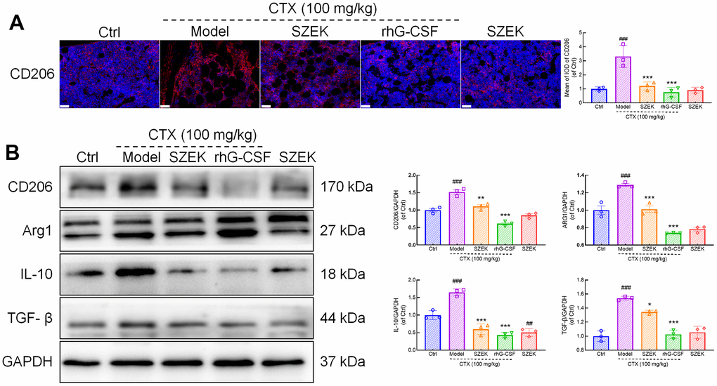 Macrophages play a key role in hematopoiesis [6], and are typically categorized into two types, M1 and M2, based on their activation status [25]. Among the results of intestinal flora and metabolome, some intestinal bacteria and metabolites were found to be able to influence macrophage differentiation and activity. The relationship between the pro-hematopoietic action of SZEK and macrophage regulation was further explored. CD206 and arginase-1 (ARG1) are markers of M2 macrophages [26]. Immunofluorescence showed that the expression of CD206 in the bone marrow of mice with hematopoietic dysfunction increased by 230.89% (P<0.001) compared to that in normal mice, and decreased by 63.52% (P<0.001) and 77.04% (P<0.001) after SZEK or rhG-CSF administration, respectively (Figure 6A). Similarly, in the spleen of mice with hematopoietic dysfunction, the protein levels of CD206 and ARG1 increased by 51.88% (P<0.001) and 28.71% (P<0.001), respectively, compared to the Ctrl group; SZEK administration reduced CD206 and ARG1 proteins by 27.34% (P<0.01) and 21.44% (P<0.001), respectively (Figure 6B). IL-10 and TGF-β are cytokines associated with M2 macrophages [27]. Compared to the Ctrl group, IL-10 levels were increased by 64.69% (P<0.001) and TGF-β levels were increased by 54.08% (P<0.001) in the spleen of mice with hematopoietic dysfunction, and after SZEK administration, they were reduced by 63.79% (P<0.001) and 12.81% (P<0.05), respectively (Figure 6B). These data suggest that SZEK can inhibit the levels of M2 macrophages and related cytokines in mice with hematopoietic dysfunction.