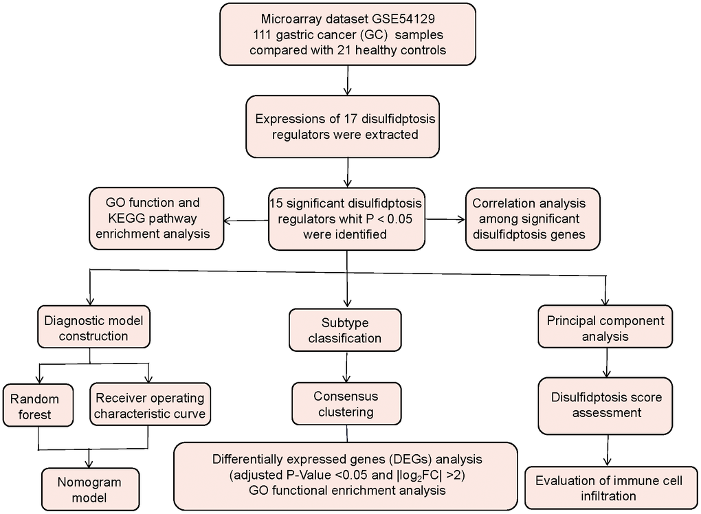 On the basis of the GSE54129 dataset, we evaluated disulfidptosis regulators’ contributions to the discovery of GC subtypes and diagnostic biomarkers. We created a gene model for GC susceptibility based on 15 potential disulfidptosis regulators including FLNA, FLNB, MYH9, TLN1, ACTB, PRDX1, SLC7A11, SLC3A2, RPN1, NCKAP1, NDUFA11, OXSM, NDUFS1, GYS1, RAC1, and discovered that the model offered patients good clinical advantages. Notably, we discovered two distinct disulfidptosis patterns that were highly correlated with abundant immune cell infiltration, suggesting that disulfidptosis patterns may be used to diagnose GC and offer follow-up treatment options. Moreover, we examined the correlation between disulfidptosis patterns and IL6, and IL33 which have close association with natural killer cell immunity in GC. Figure 1 displayed the flowchart of study design and process.
