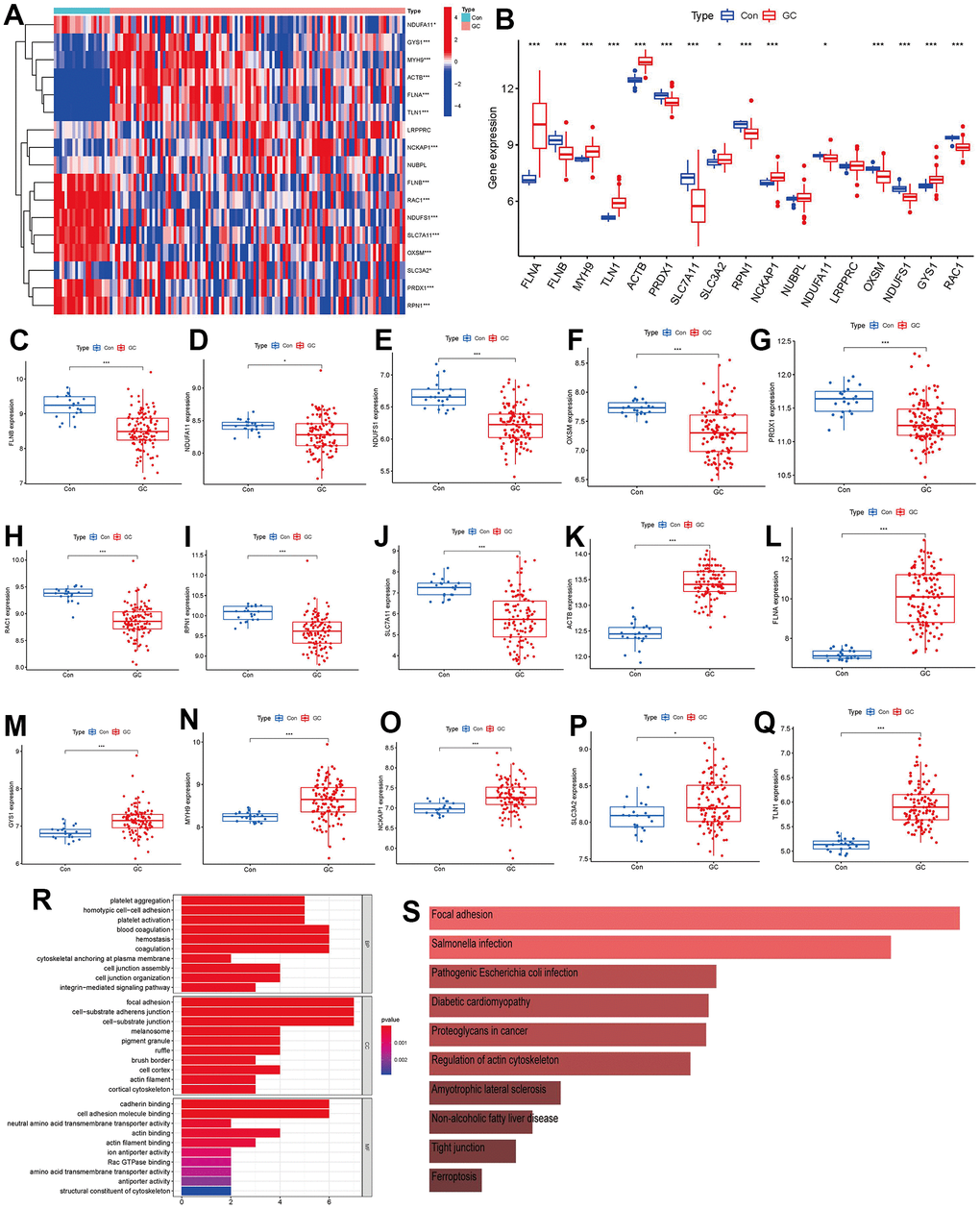 A total of 17 disulfidptosis regulators were determined through gene expressions between difference from the two groups of controls and GC cases. We ultimately discovered 15 distinct disulfidptosis regulators (FLNA, FLNB, MYH9, TLN1, ACTB, PRDX1, SLC7A11, SLC3A2, RPN1, NCKAP1, NDUFA11, OXSM, NDUFS1, GYS1, RAC1), which were shown in a heat map and boxplot (Figure 2A, 2B). We observed that the expressions of ACTB, FLNA, GYS1, MYH9, NCKAP1, SLC3A2 and TLN1 were increased in GC cases compared to controls, but the other significant regulators of disulfidoptosis exhibited opposite outcomes (Figure 2C–2Q). We observed that GO enrichment results including biological process (cytoskeletal anchoring at plasma membrane), cellular components (cortical cytoskeleton), molecular function (structural constituent of cytoskeleton) were the mainly enriched entries (Figure 2R). Notably, KEGG enrichment analysis showed that the regulations of actin cytoskeleton and ferroptosis were the mainly enriched pathways (Figure 2S). The detailed information of GO and KEGG enrichment analysis was shown in Supplementary Tables 1, 2.