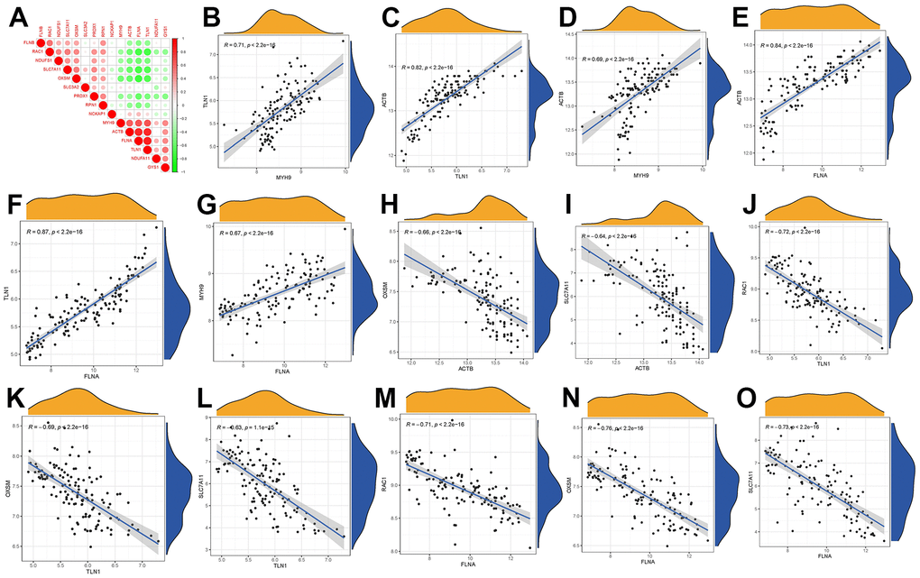 In Figure 3A, we demonstrated different correlations between different disulfidptosis modulators in GC. Then, we screened the significant correlations with |R|>0.6 for visualization. There existed significantly positive correlations in the gene expression levels of ACTB-TLN1, TLN1-MYH9, ACTB-MYH9, ACTB-FLNA, MYH9-FLNA, TLN1-FLNA in GC cases (Figure 3B–3G), while the gene expression levels of OXSM-ACTB, SLC7A11-ACTB, RAC1-TLN1, OXSM-TLN1, SCL7A11-TLN1, RAC1-FLNA, OXSM-FLNA, SLC7A11-FLNA in GC cases exhibited significantly negative correlation (Figure 3H–3O).