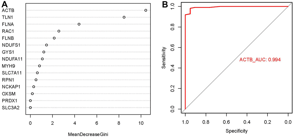We presented these 15 significant disulfidptosis regulators after ranking them in order of importance score (mean decrease Gini) and selected ACTB with the highest importance score as the hub gene (Figure 4A). Thereafter, we used ROC curves to estimate the model, and the AUC value of ACTB was 0.994, indicating that the RF model has high accuracy to predict the occurrence of GC (Figure 4B).