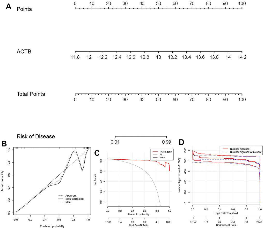 For the purpose of predicting the prevalence of GC patients, we created a nomogram model of the hub gene ACTB using the “rms” package in R (Figure 5A). We found that the nomogram model demonstrated great prediction accuracy based on calibration curves (Figure 5B). From 0 to 1, the red line in the DCA curve continued to be higher than the gray and black lines, indicating that GC patients may benefit from judgments made using the nomogram model (Figure 5C). Additionally, we observed that the predictive capacity of the nomogram model was remarkable on the basis of the clinical impact curve (Figure 5D).