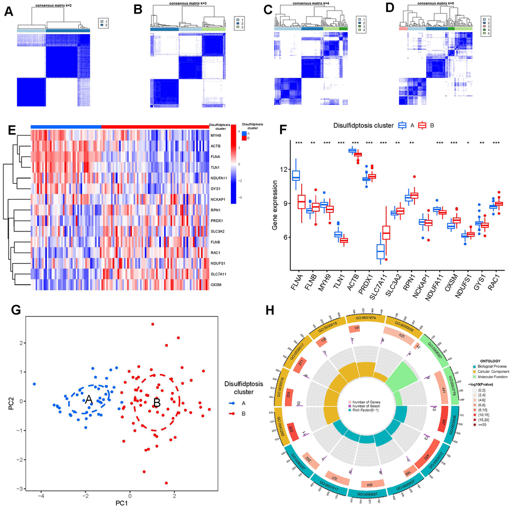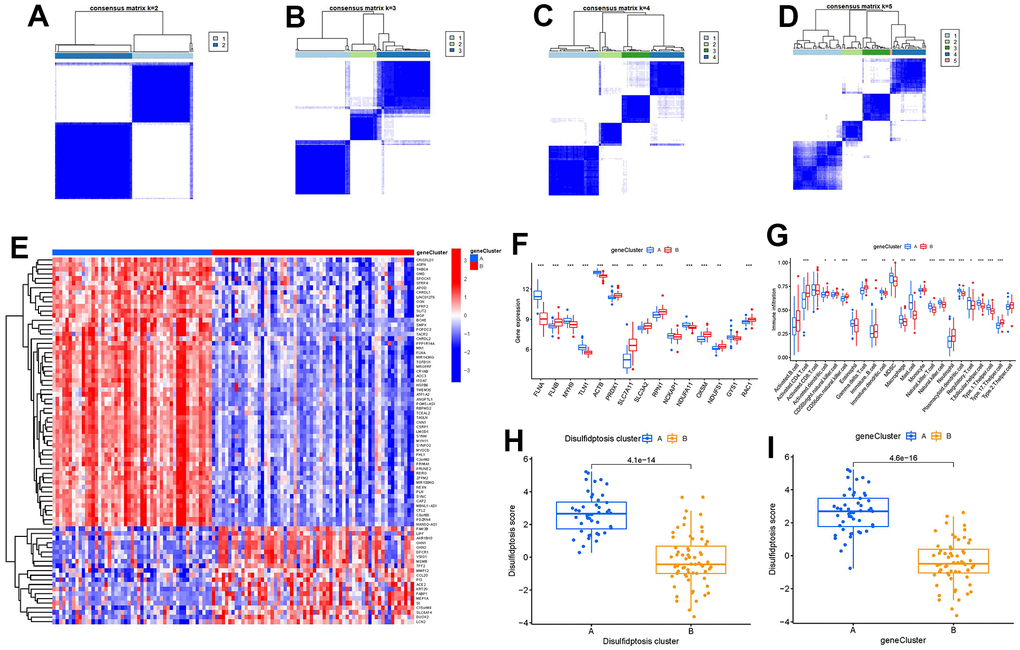 Using consensus clustering relying on resampling, each member and its subcluster number are identified, validating that the clusters are rational [11]. Based on significant disulfidptosis regulators, the “ConsensusClusterPlus” R package was used to identify different disulfidptosis patterns [12].