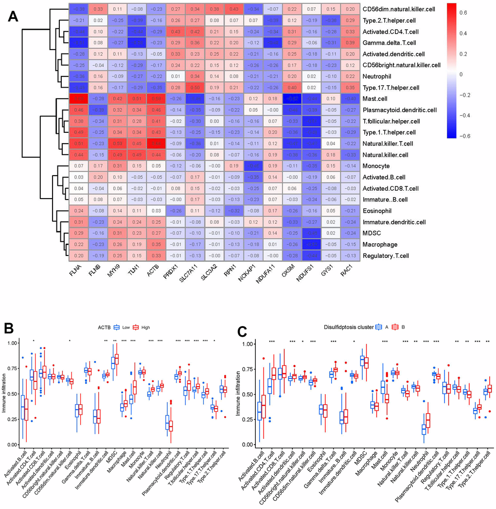 Then, we investigated the link between immune cells and 15 significant disulfidptosis regulators using ssGSEA to determine the immune cell abundance in GC samples. We noticed a positive correlation between ACTB and many immune cells (Figure 7A). Between patients with high and low ACTB expressions, we examined the variations in immune cell infiltration. According to the findings, GC patients with high ACTB expression had a higher enhanced immune cell infiltration than patients with low ACTB expression (Figure 7B). We discovered that clusterB was linked to activated CD4 T cell, activated dendritic cell, CD56bright natural killer cell, CD56dim natural killer cell, gamma delta T cell, neutrophil, Type 17 T helper cell, Type 2 T helper cell immunity, while clusterA was linked to the immunity of immature dendritic cell, mast cell, natural killer T cell, natural killer cell, plasmacytoid dendritic cell, T follicular helper cell, Type 1 T helper cell (Figure 7C).