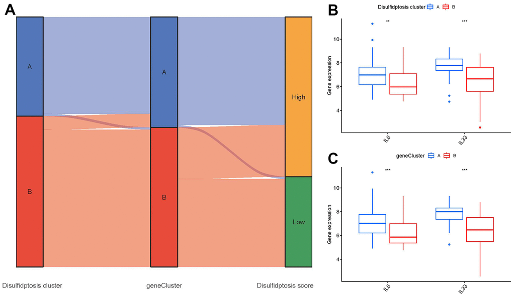 The relationship between disulfidptosis scores, disulfidptosis patterns, and disulfidptosis gene patterns was shown in virtue of a Sankey diagram (Figure 9A). To investigate the relationship between disulfidptosis patterns and GC, we examined the correlation between disulfidptosis patterns and IL6, IL33 which have close association with natural killer cell immunity. We found that clusterA or gene clusterA had higher levels of IL6 and IL33 expression than clusterB or gene clusterB, indicating that disulfidptosis patterns was strongly connected with GC defined by natural killer cell (Figure 9B, 9C).