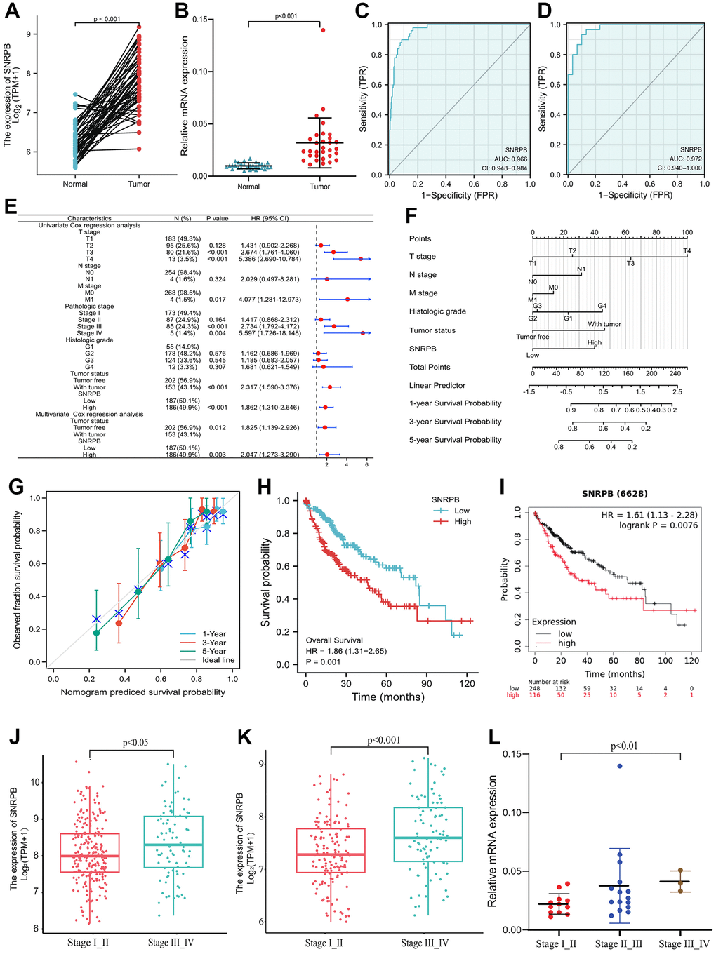We adopted Cox regression analysis on the following variables: T, N, M stages, histologic grade, tumor status, and SNRPB, and used the ggplot2 package to construct forest plots. Then, used the RMS package and survival packages to construct nomogram and calibration curves.