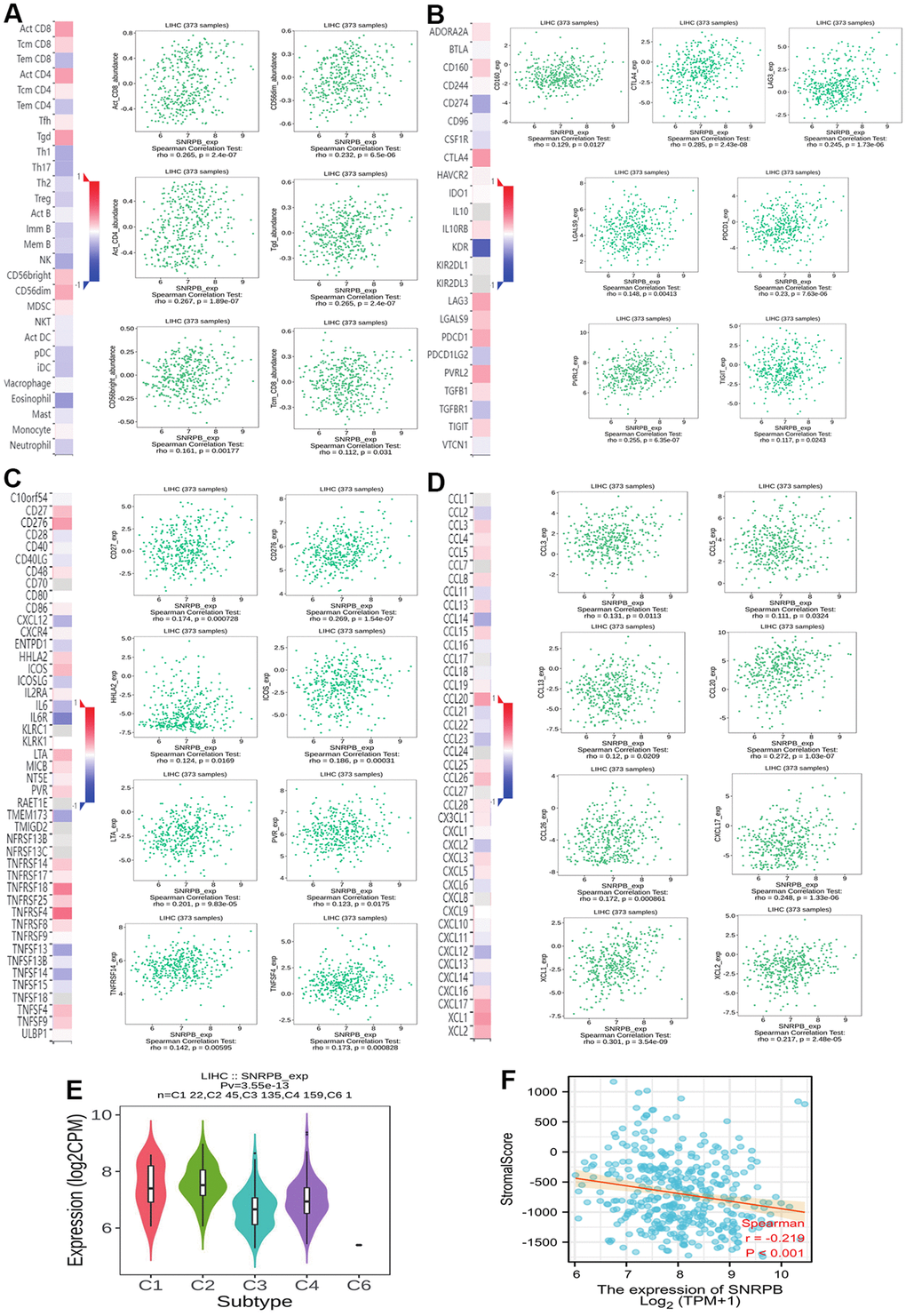 To explore the relationship of SNRPB with immunity, we first compared the distribution of immune cells under different SNRPB expression levels via TISIDB. We discovered that the distribution of six immunity cells, including activated CD8+ T (Act CD8) cells, central memory CD8+ T (Tcm CD8) cells, and gamma-delta T (Tgd) cells were positively related to SNRPB expression, and the distribution of thirteen immunity cells, including effector memory CD8+ T (Tem CD8) cells, T helper 1 (Th1) cells, and plasmacytoid dendritic cells (pDC) were negatively related to SNRPB expression (Figure 2A). In addition, seven key immune checkpoints, including the CD160, CTLA4, LAG3, LGALS9, PDCD-1, CD112 (PVRL2), and TIGIT (Figure 2B), eleven key immune inhibitors, including CD27, CD276, and HHLA2 (Figure 2C), and eleven chemokines, including CCL3, CCL5, and CCL8 (Figure 2D) were significantly positively related to SNRPB expression. SNRPB expression was significantly differences among the different HCC immune subtypes and was higher in C2 (C2 > C1 > C4 > C3) (Figure 2E). SNRPB expression was also negatively related to the immune stroma score (Figure 2F).