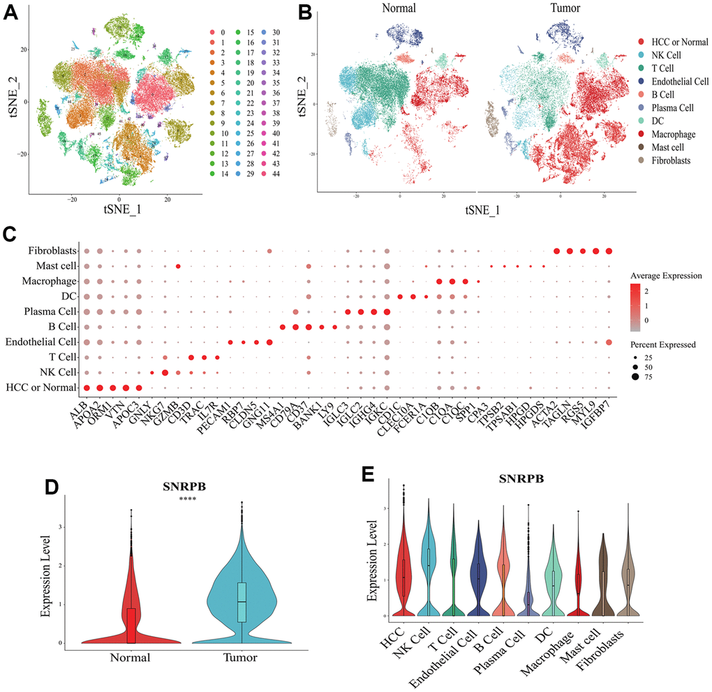 t-distributes stochastic neighbor embedding (t-SNE) analysis showed that a total of 44 cell clusters were obtained from 10 HCC samples and 8 normal samples (Figure 3A). The cell clusters were annotated according to cluster-specific marker genes, and the 44 cell clusters were divided into 10 cell types, including HCC or normal epithelial cells, natural killer (NK) cells and plasma cells (Figure 3B). The specific marker genes expression of 10 cell types were visualized (Figure 3C). Compared with normal epithelial cells, SNRPB was significantly higher expressed in HCC cells (Figure 3D), and SNRPB was expressed in all 10 cell types, with the highest expression level in NK cells and the lowest expression level in plasma cells (Figure 3E).