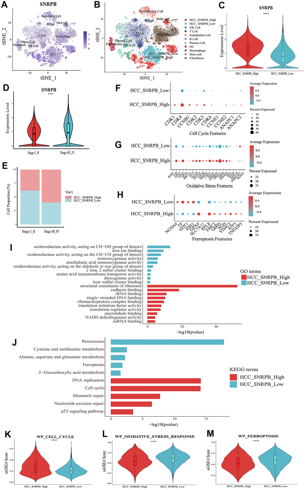 Gene Ontology (GO) enrichment analysis showed that HCC_SNRPB_Low cell subset was mainly related to oxidative stress-related and ferroptosis-related functions (oxidoreductase activity, monooxygenase activity, iron ion binding, etc.). The HCC_SNRPB_High cell subset was mainly related to cell cycle (single-stranded DNA binding, structural constituent of ribosome, cadherin binding, etc.) (Figure 4I). Kyoto Encyclopedia of Genes and Genomes (KEGG) pathway analysis showed that HCC_SNRPB_Low cell subset was mainly related to oxidative stress-related pathways (peroxisome and 2-oxocarboxylic acid metabolism) and ferroptosis-related pathways (ferroptosis, cysteine and methionine metabolism, alanine-aspartate, and glutamate metabolism). HCC_SNRPB_High cell subset was mainly related to cell cycle-related pathways (cell cycle, DNA replication, mismatch repair, etc.) (Figure 4J). These findings indicate that downregulation of SNRPB may activate oxidative stress and ferroptosis in HCC, while upregulation of SNRPB may promote cell cycle progression in HCC.