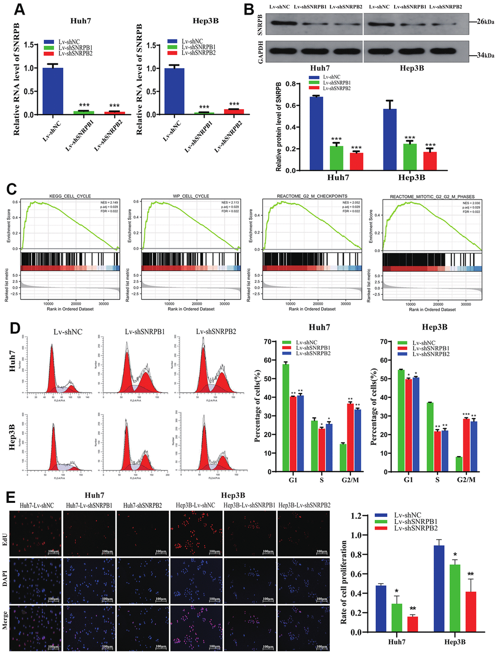 To explore SNRPB function in HCC, Huh7 and Hep3B cell lines were adopted to establish SNRPB knockdown models (Figure 5A, 5B). Gene Set Enrichment Analysis (GSEA) performed on TCGA dataset revealed that the KEGG cell cycle (N = 2.113, p = 0.029), WP cell cycle (N = 2.149, p = 0.029), reactome G2/M checkpoints (N = 2.05, p = 0.001), reactome mitotic G2/M phases (N = 2.03, p = 0.001) are significantly enriched in the high SNRPB expression samples (Figure 5C). Using flow cytometry, we found a higher proportion of cells in the G2/M phase in the SNRPB knockdown group (Lv-shSNRPB1 and Lv-shSNARPB2 groups) compared with the Lv-shNC group (Figure 5D). The results of the Edu experiment demonstrated significantly lower cellular proliferation rate in SNRPB knockdown group (Lv-shSNRPB1 and Lv-shSNRPB2 groups) compared with the Lv-shNC group (Figure 5E).