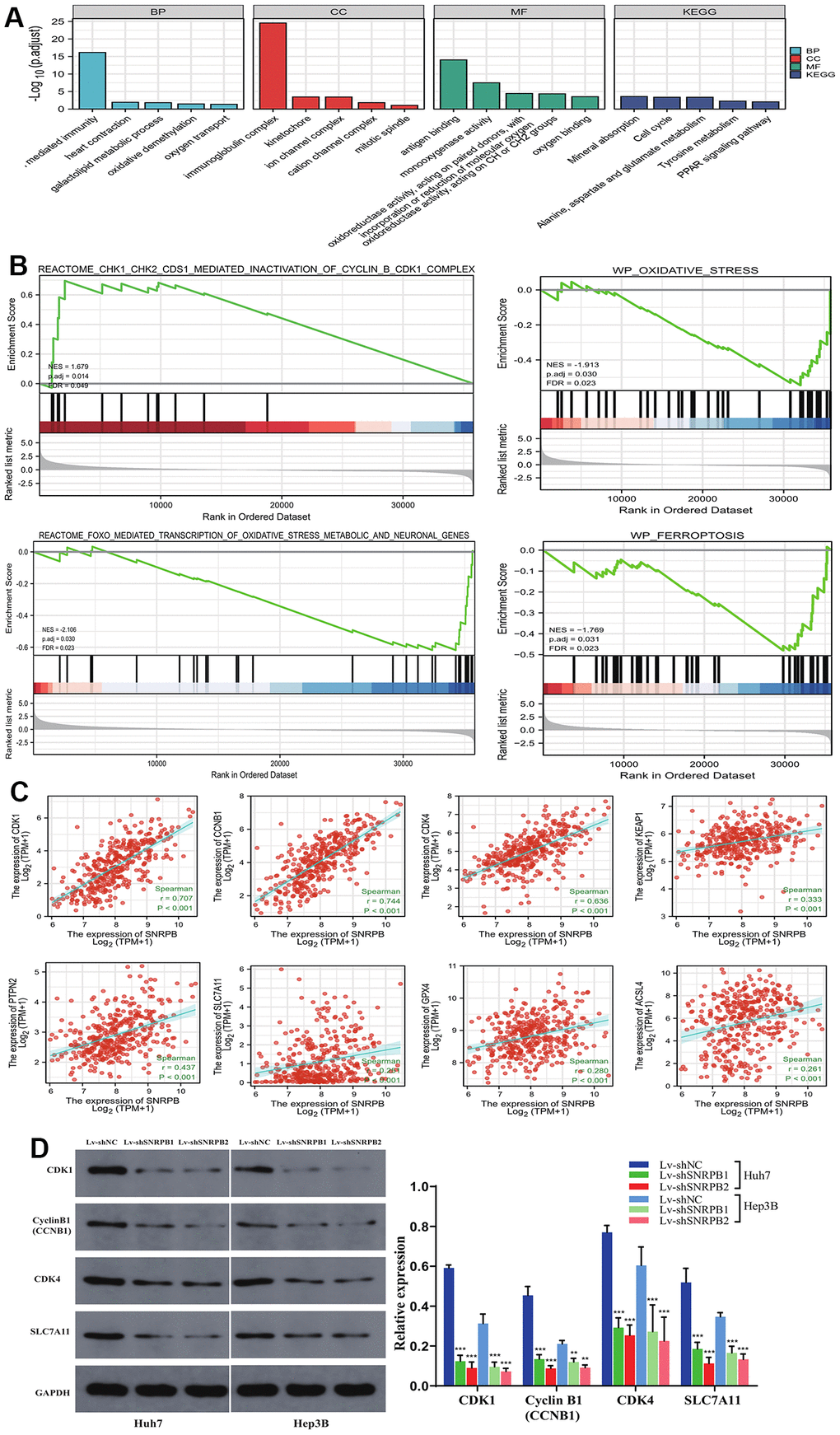 In brief, SNRPB may be an independent prognostic factor related to HCC progression and may play a role in immunotherapy. Moreover, it provides the first evidence that SNRPB knockdown not only induces G2M phase arrest and restrain cell proliferation, but also downregulates SLC7A11 expression, which is closely associated to ferroptosis. Additionally, SNRPB knockdown can enhance anticancer activity induced by sorafenib, which may offer a novel target for HCC therapies. Furthermore, previous studies on HCC therapies have been limited to immunotherapy, cell cycle, oxidative stress or ferroptosis, our study explored the role of SNRPB in HCC therapies from the perspective of the immunotherapy, cell cycle, oxidative stress and ferroptosis combination. Results suggest that SNRPB is a therapeutic target that can be integrated into immunotherapy, cell cycle therapy and sorafenib-induced ferroptosis, which provides a novel basis for HCC therapies, although the immune mechanism of SNRPB in HCC cells needs further investigation in a clinical setting.