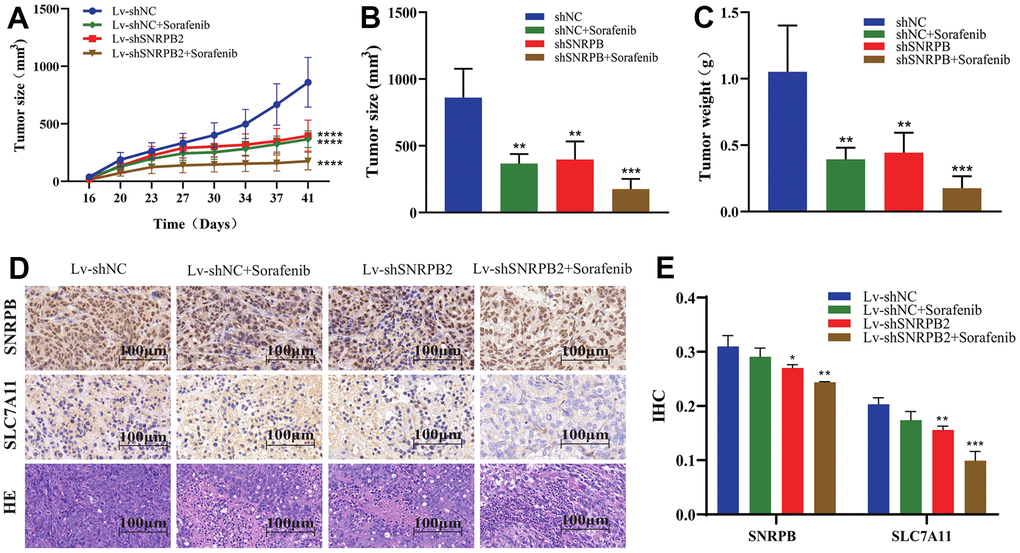 Our previous in vitro experiments found that the downregulation of SNRPB could cause the downregulation the ferroptosis-related gene, SLC7A11. Sorafenib induces the death of liver cancer cells via ferroptosis [14]. To further study the effect of SNRPB in combination with sorafenib on the growth of tumor cells in vivo, a nude mice xenograft tumor model was established through intraperitoneally injecting sorafenib when the tumor grew to 100 mm3. Results show that the tumor volume and weight of the Lv-shNC+Sorafenib, Lv-shSNRPB2, and Lv-shSNRPB2+Sorafenib groups were significantly reduced, compared to the control group, and the tumor volume and weight of Lv-shSNRPB2+Sorafenib group were the smallest (Figure 8A–8C). The Immunohistochemistry (IHC) staining results demonstrated that the SLC7A11 expression decreased significantly in the Lv-shNC+Sorafenib and the Lv-shSNRPB2 groups, and that SNRPB knockdown combined with sorafenib enhanced this effect (Figure 8D, 8E). These results indicate that SNRPB knockdown can be used in combination with sorafenib to increase its efficacy.