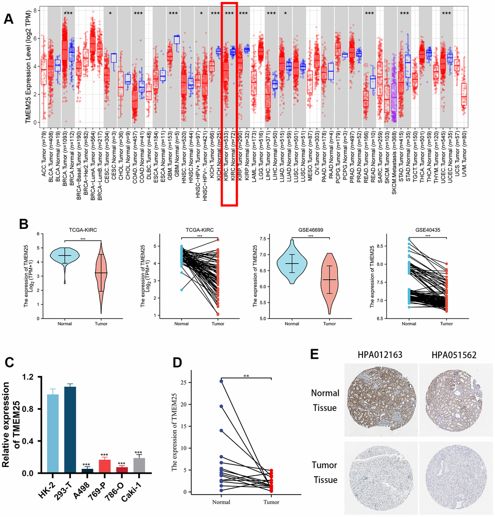 This study presents a comprehensive examination of TMEM25 expression across various cancers, accomplished through a pancancer analysis. The outcomes of this pan-cancer TMEM25 analysis, derived from the TIMER online platform. Specifically, TMEM25 exhibited high expression levels in breast invasive carcinoma (BRCA) and lung adenocarcinoma (LUAD). However, a noticeable reduction in expression was evident in several other cancers, including cervical squamous cell carcinoma and endocervical adenocarcinoma (CESC), colon adenocarcinoma (COAD), glioblastoma multiforme (GBM), kidney chromophobe (KICH), kidney renal clear cell carcinoma (KIRC), kidney renal papillary cell carcinoma (KIRP), liver hepatocellular carcinoma (LIHC), rectum adenocarcinoma (READ), stomach adenocarcinoma (STAD), and uterine corpus endometrial carcinoma (UCEC) tissues when compared to their respective normal tissues (Figure 1A). Within the TCGA-KIRC cohort, we conducted an in-depth analysis of TMEM25 expression, which showed a significant decrease in TMEM25 expression levels in ccRCC compared to normal tissue. This finding was confirmed in paired analyses of ccRCC and normal tissue samples (Figure 1B). Concurrently, our investigations extended to additional cohorts such as GSE46699 and GSE40435, where TMEM25 exhibited lower expression in ccRCC in contrast to normal tissues. This observation was further affirmed through qPCR analysis of renal cancer cell lines and renal clear cell carcinoma tissues (Figure 1C, 1D). Meanwhile, immunohistochemical assessment from the Human Protein Atlas (HPA) database confirmed low expression of TMEM25 in ccRCC (Figure 1E).