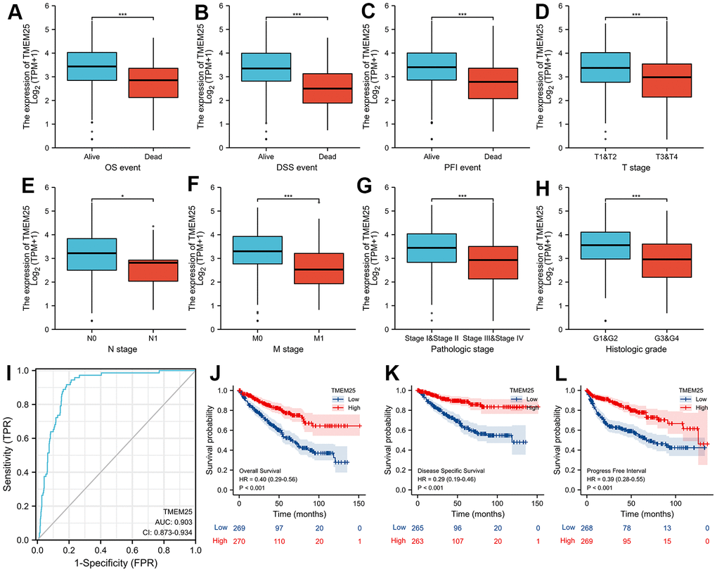 Based on the levels of TMEM25 RNA expression within the TCGA-KIRC cohort, patients were categorized into distinct groups: those with high and low expression levels. By combining these results with clinically relevant features, we revealed noteworthy associations between TMEM25 and several factors. These encompassed age (p=0.011), gender (p=0.040), T-stage (p<0.001), N-stage (p=0.009), M-stage (p<0.001), Pathologic stage (p<0.001), and Histologic grade (p<0.001) (Table 1). In addition, our study highlights large differences in key survival factors. Specifically, overall survival (OS), disease-specific survival (DSS) and progression-free interval (PFI) exhibited significant differences between the two groups of ccRCC patients (all p-values < 0.001) (Table 1). In this study, we found that for OS, DSS, and PFI the expression of TMEM25 was lower in the presence of adverse events (for example death events). Similarly, the expression of TMEM25 was significantly lower in later T-stages, N-stages, M-stages, pathological stages and histological stages than in corresponding earlier stages (Figure 2A–2H).
