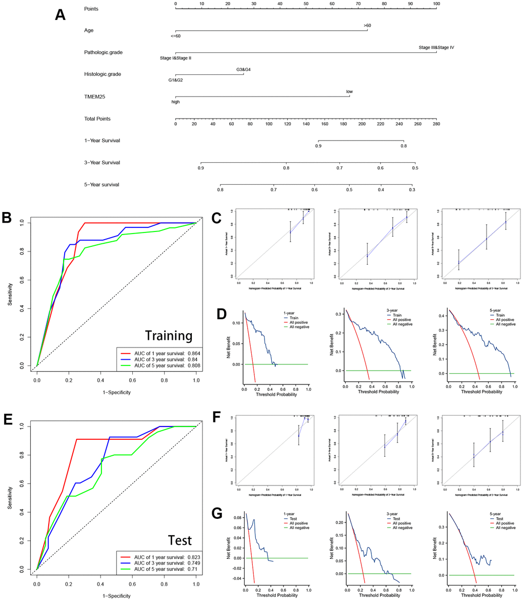 To further validate the independent prognostic significance of TMEM25 in ccRCC, we partitioned patients within the KIRC dataset into two groups: TMEM25 high expression and TMEM25 low expression, based on the median TMEM25 expression values. Our initial step involved selecting OS, DSS, and PFI as dependent variables. Subsequently, we conducted univariate and multivariate COX regression analyses, incorporating TMEM25 and significant clinical characteristics. This aimed to ascertain whether TMEM25 stood as an independent prognostic factor, calculated by determining the corresponding Hazard Ratios (HR) and the two-sided p-values within a 95% confidence interval. Proceeding to the second step, we constructed a nomogram using the R package “rms”. This nomogram allowed us to predict the overall survival at 1, 3, and 5 years for ccRCC patients, utilizing the data derived from the previous analysis. The final step encompassed the validation of the nomogram. To achieve this, we randomly partitioned the TCGA-KIRC cohort into training and test groups using the “Caret” package. Subsequently, we evaluated the discrimination performance of the nomograms and their consistency with actual observations by means of the C-index and the calibration graphs, respectively. Additionally, we plotted DCA curves for both the training and test groups to determine the clinical utility of the nomogram.