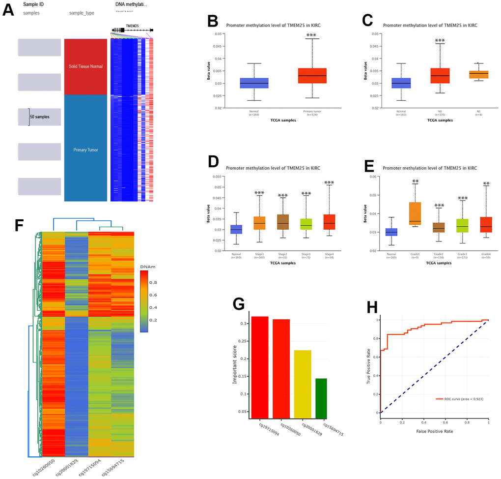 In our pursuit of understanding the role of TMEM25 methylation in ccRCC, we turned to platforms like UCSC Xena and UALCAN. These resources illuminated the distinct methylation patterns within ccRCCs and their correlation with various clinical characteristics. In addition, findings from the DNMIVD database suggest that DNA methylation levels of TMEM25 can be used as a predictive marker for survival and diagnosis of ccRCC patients.