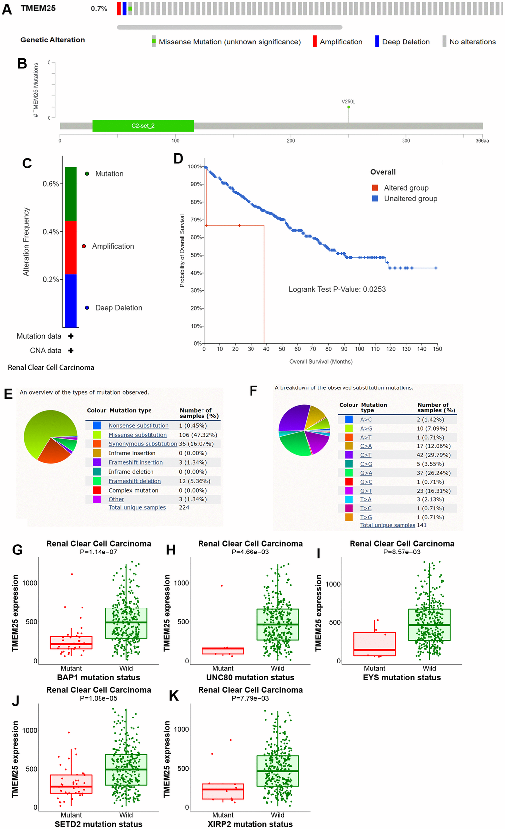 The cBioPortal website provides a comprehensive dataset encompassing 538 ccRCC patients from the TCGA, particularly through the Firehose Legacy project. This dataset includes essential information about genetic alterations and prognostic survival outcomes. Within this cohort, a relatively small percentage (0.7%) of ccRCC patients exhibit mutations in the TMEM25 gene. These mutations primarily manifest as missense mutations and amplifications. Notably, the patients with TMEM25-altered genomes exhibit significantly lower overall survival rates in comparison to those with unaltered genomes, a difference that holds statistical significance (p=0.0253). These trends are effectively visualized in Figure 7A–7D. COSMIC website shows the types of mutations in TMEM25 in different cancers. Missense substitutions and synonymous substitutions are main mutation types, with C>T and G>A mutations emerging as the most common substitution alterations (Figure 7E, 7F). Employing the muTarget website for mutation status and TMEM25 expression analysis has uncovered an intriguing correlation. It’s evident that TMEM25 expression experiences a notable reduction in the presence of mutant phenotypes linked to genes like BAP1, EYS, SETD2, UNC80, and XIRP2 (Figure 7G–7K). This analysis highlights the intricate interactions between TMEM25 mutations and the expression profiles of these related genes.