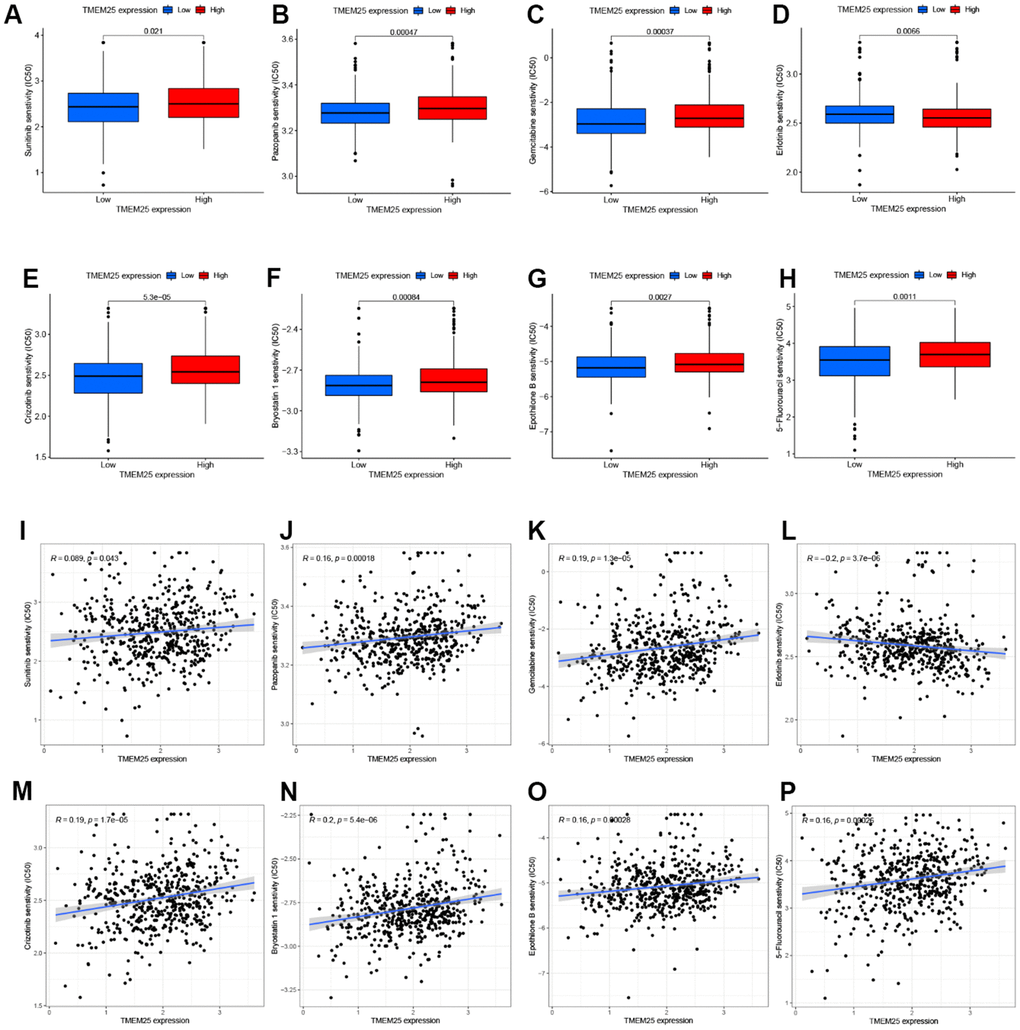 Intriguingly, we also aimed to measure the differential sensitivity of certain drugs between groups characterized by high and low TMEM25 expression. To achieve this, we harnessed the “pRRophetic” R package, enabling us to compute the respective IC50 values based on the “cgp2016ExprRma” dataset. This analysis facilitated a comparative assessment of drug sensitivity.