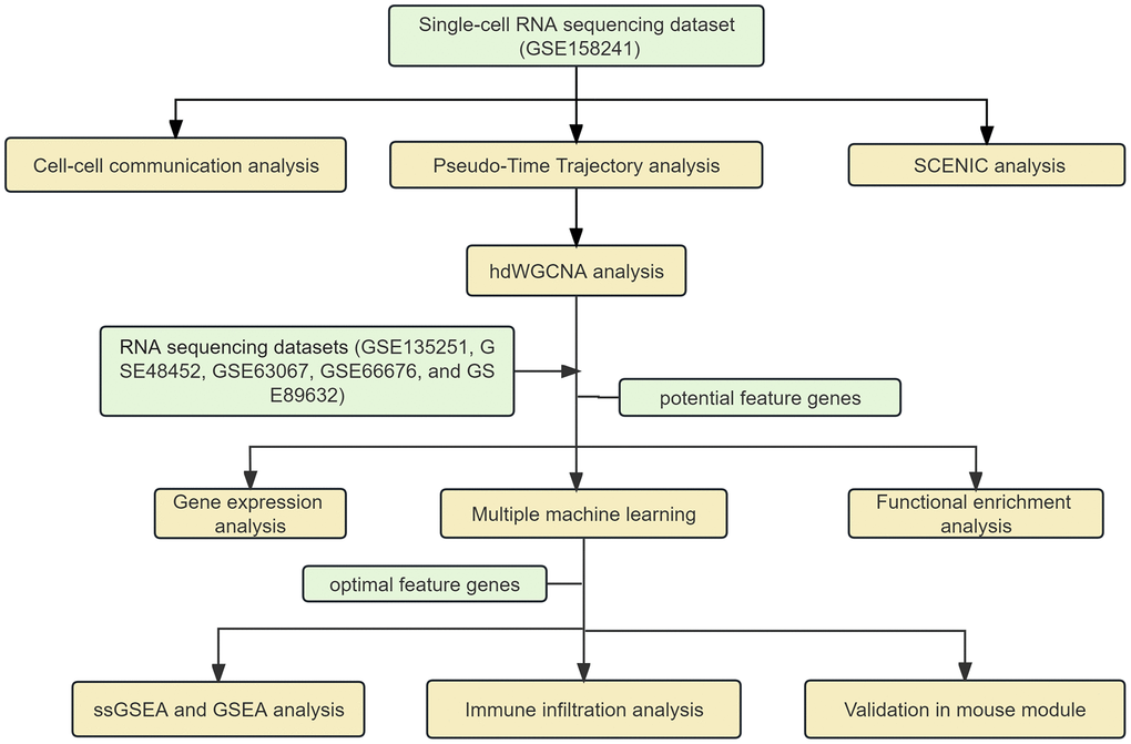 Over the past few years, the rapid development of single-cell transcriptomics has revolutionized the high-resolution analysis of cellular composition and heterogeneous cellular states, which has considerably contributed to our understanding of the composition of immune cells in liver tissues in NAFLD disease [11]. Weighted gene co-expression network analysis (WGCNA), an unbiased systems biology analysis method, aims to explore the co-expressed gene modules and identify core genes in the networks, whereas it can only be used for bulk RNA sequencing (RNA-seq) data [12]. Unlike WGCNA, the high-dimensional weighted correlation network analysis (hdWGNCA) could constitute an integrated functional framework for co-expression networks based on single-cell RNA sequencing (scRNA-seq) data [13]. Previous studies have not delved into the characteristic markers of NAFLD at the single-cell level [14]. In our investigation, we coordinated scRNA-seq data and RNA-seq datasets to screen key signature genes contributing to NAFLD diagnosis by hdWGCNA and multiple machine learning algorithms, which may contribute to the early diagnosis and treatment of NAFLD (Figure 1).