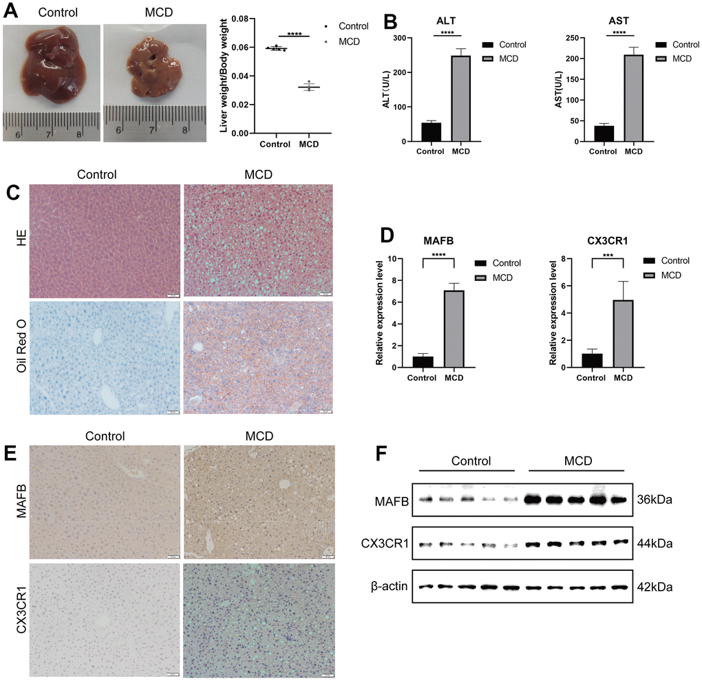 The methionine and choline deficiency (MCD) diet-induced NAFLD model is one of the most classical models. Its principle involves the deficiency of methionine and choline, which hinders the necessary processes of beta-oxidation and very low-density lipoprotein synthesis [50]. Mice fed with the MCD diet exhibit characteristics such as weight loss, decreased levels of serum triglycerides (TG), and reduced liver weight-to-body weight ratio, which are contrary to the phenotype of human fatty liver disease [51]. Pathological validation of the model commonly involves the use of HE and oil red O staining. Through validation using the MCD mouse model, we observed increased expression of MAFB and CX3CR1 at the RNA and protein levels in liver tissue, further confirming their accuracy in the diagnosis of NAFLD.