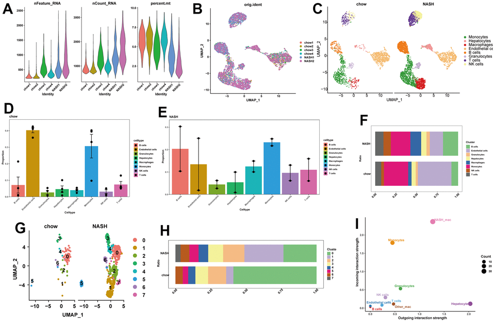 We initially obtained a total of 6888 cells from a scRNA-seq data set containing the livers of two NASH mice and four normal mice. Following quality control and removal of batch effects, a total of 6875 cells were used for single-cell clustering analysis (Figure 2A, 2B and Supplementary Figure 1A–1D). After cell annotation, we could observe 8 distinct cell types on the UMAP plot, including hepatocytes, epithelial cells, endothelial cells, T cells, NK cells, macrophages, granulocytes, and B cells (Figure 2C). We then analyzed the proportions of different cell types in NASH and normal mouse livers (Figure 2D, 2E). Interestingly, macrophages, B cells, and NK cells showed increased proportions in NASH compared to the normal group (Figure 2F). Given the crucial role of macrophages in the liver, we selected macrophages for further analysis. After clustering the macrophages, we identified seven subclusters of macrophages. Notably, subcluster 1 was significantly more prevalent in the NASH group, and subcluster 7 was specific to NASH (Figure 2G, 2H). Therefore, we labeled subcluster 1 and subcluster 7 as NASH-macrophages. Next, we performed cell-to-cell communication analysis between different cells in the liver. The results revealed that NASH-macrophages exhibited highly active signaling communication with other cells, while the other-macrophages had rarely communicated with other cells. (Figure 2I). Of interest, NASH-macrophages received more signals than other cells, and hepatocytes were identified as the strongest senders (Figure 2I). This indicates that NASH-macrophages may play a critical role in the progression of NAFLD.