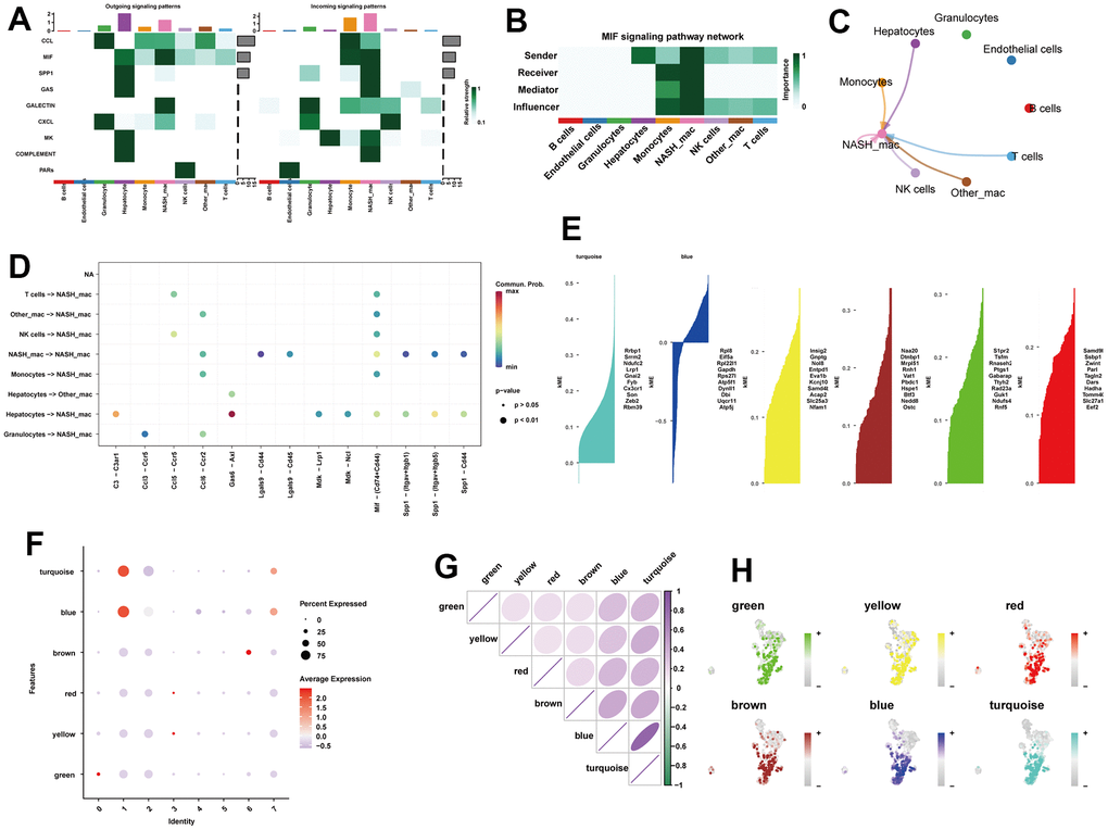 Cell communication detected a total of 9 significant pathways, including CCL, MIF, SPP1, GAS, GALECTIN, CXCL, MK, COMPLEMENT, and PARs (Figure 3A). Of note, the macrophage migration inhibitory factor (MIF) signaling pathway exhibited great strength in both incoming and outgoing signal patterns of NASH-macrophages (Figure 3A). Within the MIF signaling pathway, NASH-macrophages were found to be the strongest sender, receiver, mediator, and influencer (Figure 3B, 3C). Ligand-receptor analysis indicated that Gas6-Axl was significantly activated in the paracrine signaling from hepatocytes to NASH-macrophages (Figure 3D). In view of the critical role of macrophages, we explored the hdWGCNA analysis to identify potential markers of macrophages. After setting the soft threshold to eight, we identified six modules (Supplementary Figure 2). As shown in Figure 3E, six gene modules were obtained, and the top 10 most influential genes were listed according to the hdWGCNA. Of interest, we found that the turquoise and blue modules were greatly expressed in subcluster 1 and subcluster 7 macrophages (Figure 3F). Additionally, the blue module exhibited a strong positive correlation within turquoise module (Figure 3G). Moreover, UMAP plots illustrated the distribution of the turquoise and blue modules in macrophages, which extremely overlapped with subcluster 1 and subcluster 7 macrophages (Figure 3H). Therefore, we proposed that the turquoise and blue modules may represent characteristics of NASH-macrophages. The top 20 genes from each of the turquoise and blue modules were considered as potential feature biomarkers of NAFLD.