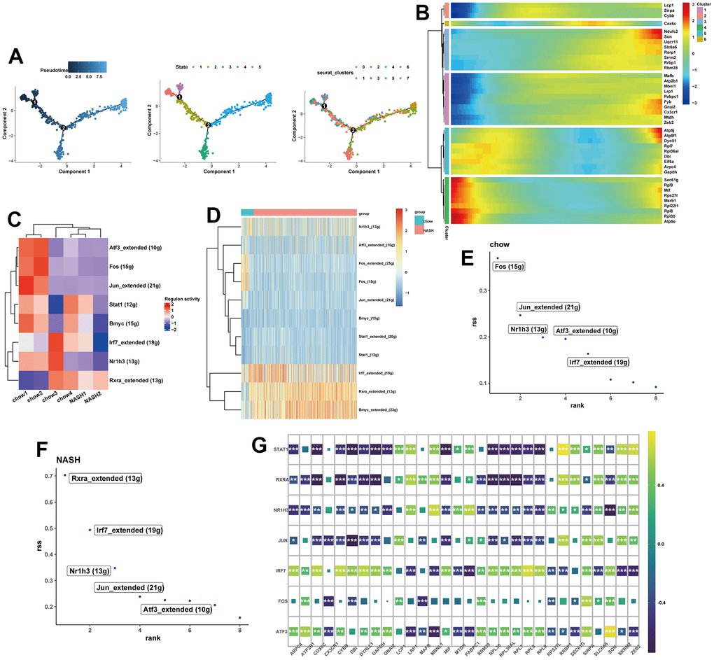 To determine the transcriptional features of macrophage development at different stages, we performed a pseudo-time analysis. Cells with similar states are grouped, and branch points separate cells into different states. Notably, cluster 1 and cluster 7 macrophages were mainly located at the end of the pseudo-time trajectory (Figure 4A). We intersected genes from the turquoise and blue modules with human transcriptional genes, resulting in 30 potential feature genes. Besides, the changes of potential feature genes in the differentiation were detected based on the gene expression levels in different subclusters of macrophages (Figure 4B). In order to further explore the transcriptional regulatory network underlying NASH, we subsequently used SCENIC algorithm to infer the transcription factors (TFs) behind NASH disease. SCENIC analysis revealed that certain TFs exhibited distinct activation and deactivation patterns across different samples (Figure 4C). We then detected 3 upregulated TFs and 8 downregulated TFs in the NASH group (Figure 4D). Additionally, a regulon specificity score (RSS) was defined based on Jensen-Shannon divergence for each group [32]. In the normal group, the transcription factor with the highest score was identified as Fos, while the RXRa ranked first in the NASH group (Figure 4E, 4F). In addition, transcription factors were closely related to potential feature genes (Figure 4G).