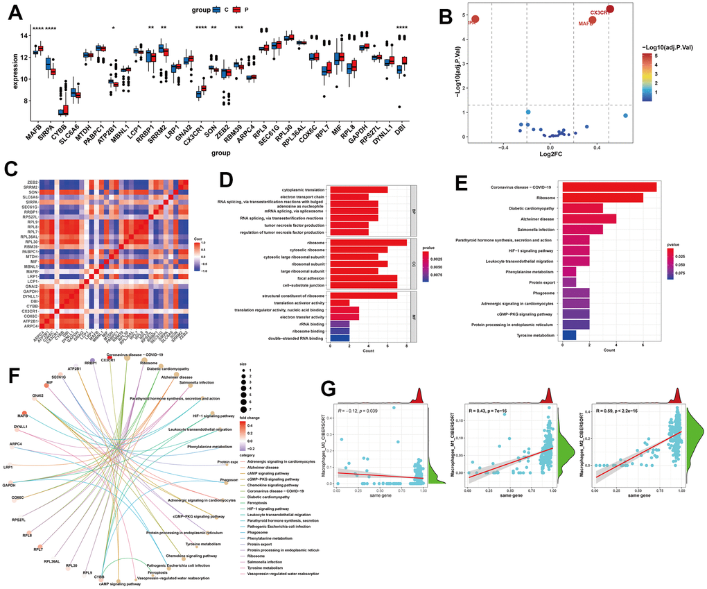 Next, we analyzed the expression levels of these 30 potential feature genes in the livers of normal individuals and NAFLD patients using RNA-seq data. We found that SIRPA, ATP2B1, RRBP1, SRRM2, SON, and RBM39 were significantly downregulated in NAFLD samples, while MAFB, CX3CR1, and DBI were significantly upgraded (Figure 5A). Among all the differentially expressed genes, CX3CR1, SIRPA, and MAFB showed the largest differences (Figure 5B). And these 30 genes exhibited close associations with each other (Figure 5C). In terms of GO enrichment analysis, the potential feature genes were enriched in biological processes (BP), such as Cytoplasmic translation, RNA splicing, via transesterification reactions with bulged adenosine as nucleophile, mRNA splicing, via spliceosome, RNA splicing, via transesterification reactions; and cellular components (CC), such as Ribosome, Focal adhesion, Cell-substrate junction; and molecular functions (MF), such as Structural constituent of ribosome (Figure 5D). In the KEGG enrichment analysis, these genes were significantly enriched in pathways related to Coronavirus disease-COVID-19, Ribosome, and Alzheimer’s disease (Figure 5E, 5F). We also analyzed the overall relationship of the potential feature genes as a whole and their associations with immune cell infiltration. The results showed a significant association between the potential feature genes and M0, M1, and M2 macrophage infiltration, with a negative correlation with M0 and positive correlations with M2 and M1 (Figure 5G).