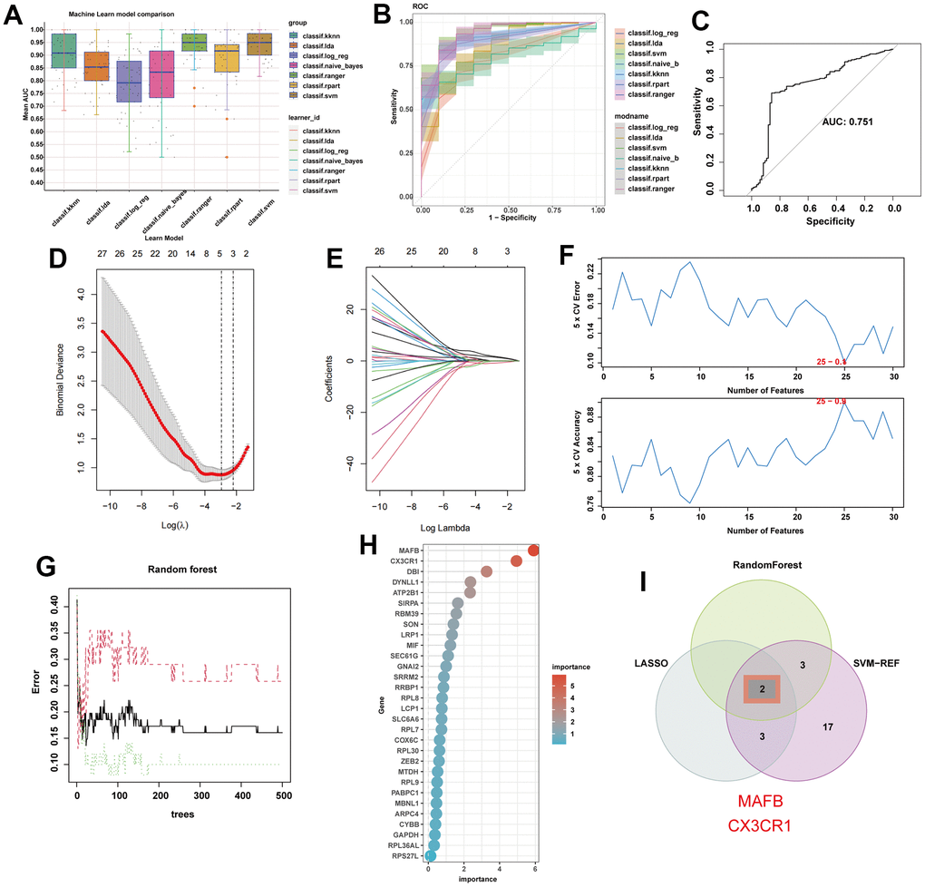 Based on the potential feature genes, seven machine learning algorithms were applied to construct models and evaluate diagnostic performance (Figure 6A). It is worth noting that the support vector machine (SVM) algorithm showed the best performance in the training set (Figure 6B), with an AUC of 0.751 in the external validation set (Figure 6C). Next, we selected three machine learning algorithms to further screen for key feature genes of NAFLD. LASSO regression was performed using the aforementioned 30 genes as input, resulting in 5 genes (Figure 6D, 6E). We filtered 25 genes using the SVM algorithm (Figure 6F) and 5 genes using the Random Forest algorithm (Figure 6G, 6H). Finally, we exploit the intersection of these gene sets to identify the optimal diagnostic genes for NAFLD: MAFB and CX3CR1 (Figure 6I).