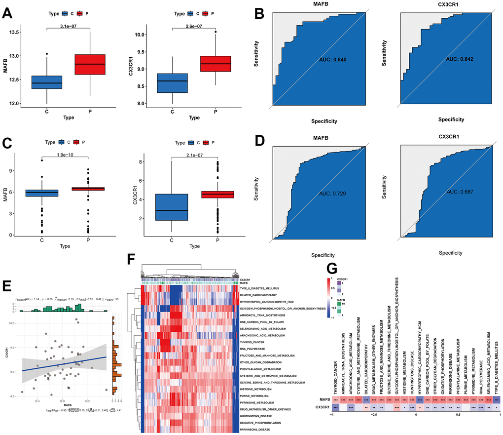 To validate the performance of the two key genes, we split the RNA-seq dataset into a training and validation set. Both MAFB and CX3CR1 consistently showed higher expression in NAFLD liver samples in both sets (Figure 7A, 7C). We assessed the diagnostic performance of these two feature genes using the ROC analyses. In the training set, MAFB and CXCR1 had AUC values of 0.840 and 0.842, respectively (Figure 7B). In the validation set, the AUC values were 0.729 for MAFB and 0.687 for CX3CR1 (Figure 7D). Furthermore, the expression of MAFB was positively linked with that of CX3CR1 (Figure 7E). Additionally, we performed pathway analysis using GSVA to identify KEGG pathways potentially associated with these two genes. As shown in Figure 7F, 7G, a total of 22 pathways were significantly associated with these two genes, including Arachidonic acid metabolism, Histidine-metabolism, Oxidative phosphorylation, Phenylalanine metabolism, Pyrimidine Metabolism, and so on.