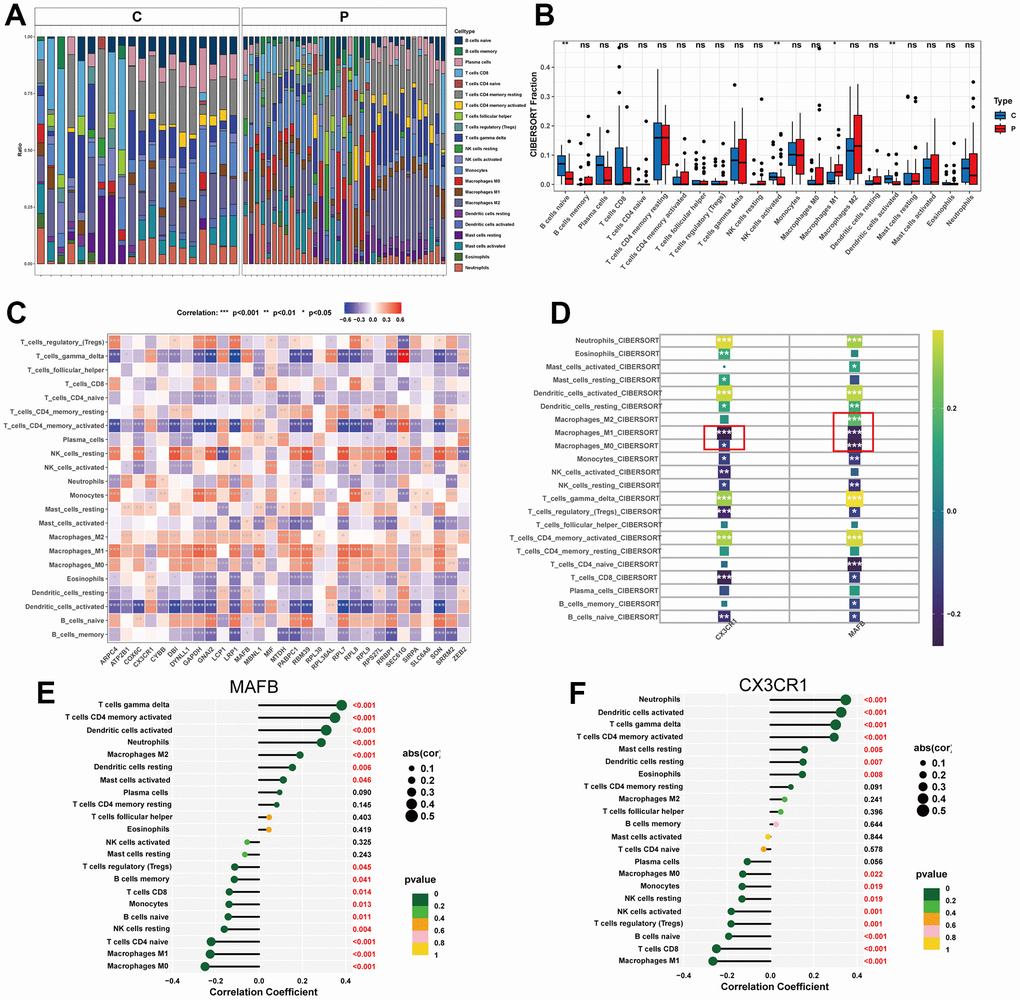 In order to comprehensively assess immune cell profiles in normal and NAFLD samples, immune infiltration analysis was conducted. According to the results of CIBERSORT, there were significant differences in immune cell infiltration levels between NAFLD and normal samples (Figure 8A). NAFLD samples had a higher proportion of M1 macrophages, but relatively lower proportions of B cells, NK cells, and Dendritic cells than normal samples did (Figure 8B). The correlation heatmap demonstrated close associations between the potential feature genes and various immune cells (Figure 8C). We also performed separate analyses of the relationship between the optimal feature genes and immune cells (Figure 8D). The results showed that MAFB displayed a positive correlation with M2 macrophages, but negatively correlated with M0 and M1 macrophages (Figure 8E, Supplementary Figure 3A–3C). CX3CR1 showed a negative correlation with M0 and M1 macrophages (Figure 8F and Supplementary Figure 3D, 3E).