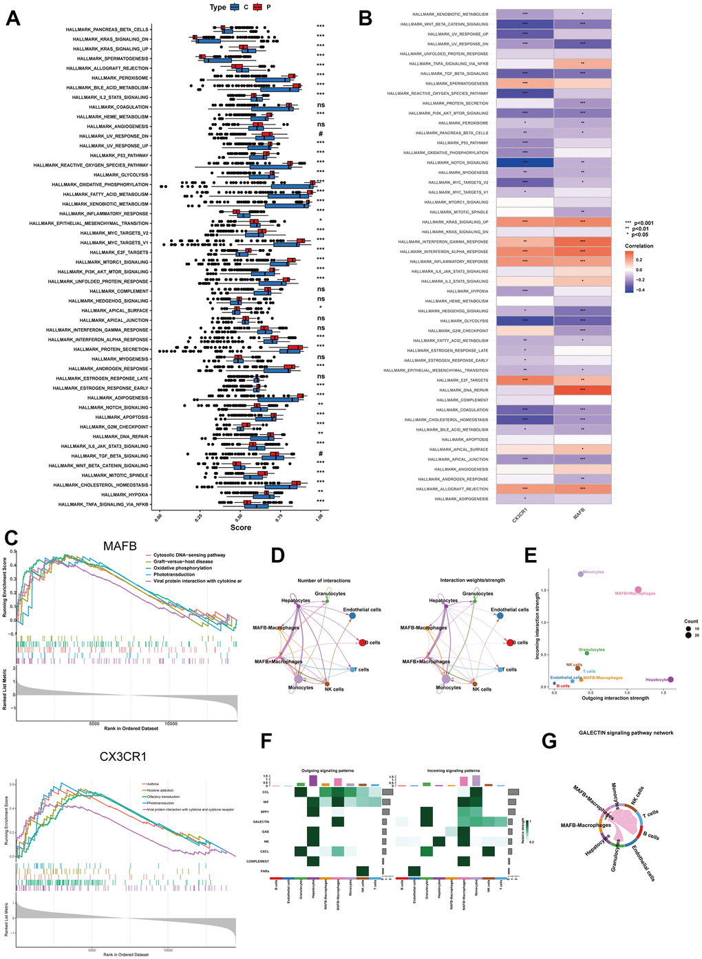 Then, we investigated the role of MAFB+ macrophages in cell communication analysis. The results revealed that MAFB+ macrophages exhibited highly active signaling communication with other cells, while the MAFB- macrophages had rarely communicated with other cells (Figure 9D, 9E). The MAFB+ macrophages took part in more outgoing and incoming pathways than MAFB- macrophages (Figure 9F). Of note, the MAFB+ macrophages exhibited great strength in both incoming and outgoing patterns in MIF signaling pathway (Figure 9G).