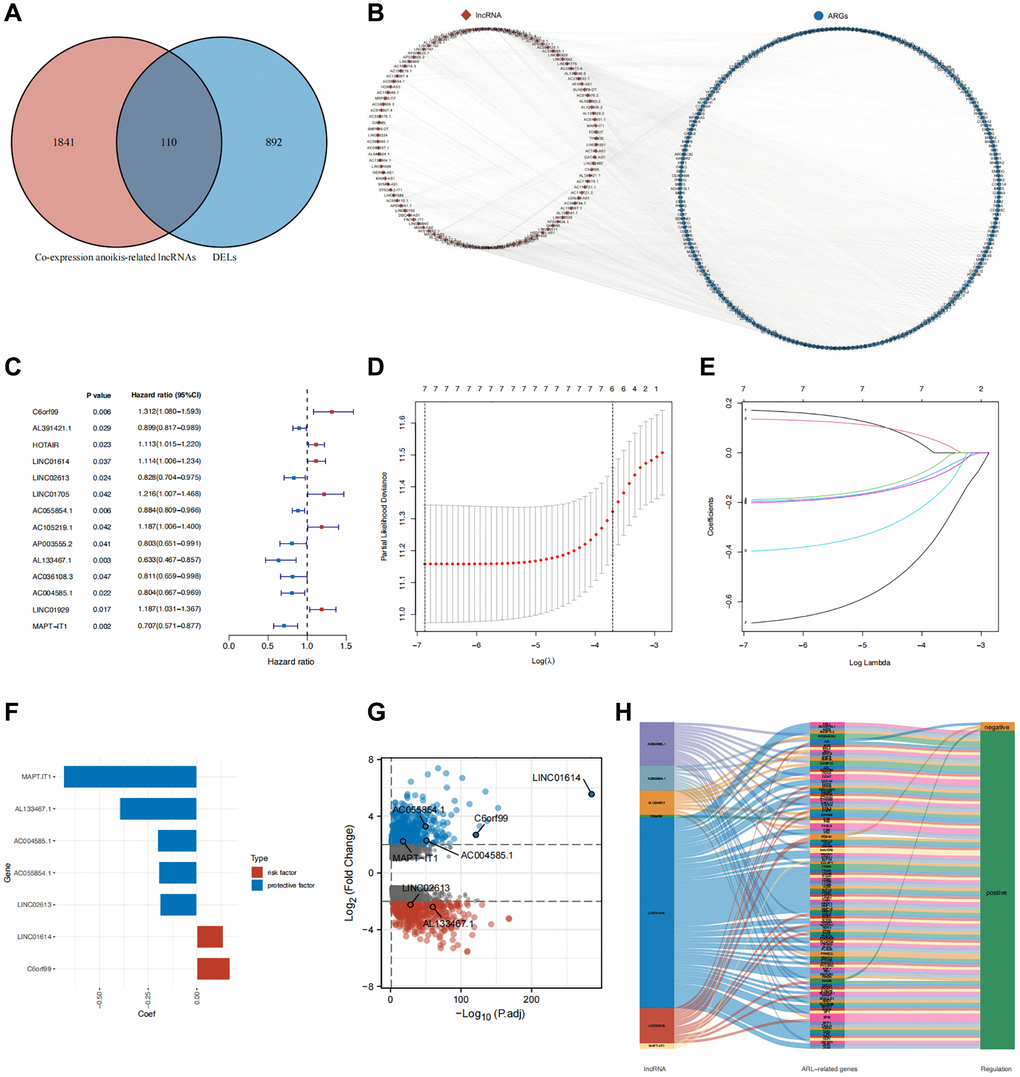 The RNA data of anoikis-related DELs and clinical information on IBC from TCGA were combined based on the sample ID. Only patients with an OS time of 30 days or more were included in further survival analyses. Univariate Cox regression analysis was performed using the Kaplan–Meier “survival” package [47]. Subsequently, for further identification of the core genes related to anoikis and the construction of an ARL score-based prognostic model, we employed the “glmnet” and “survival” packages to conduct LASSO logistic regression analysis [48]. The following formula was used to calculate the ARL score of IBC patients: C6orf99 expression value × corresponding coef + LINC01614 expression value × corresponding coef + LINC02613 expression value × corresponding coef + AC055854.1 expression value × corresponding coef + AL133467.1 expression value × corresponding coef + AC004585.1 expression value × corresponding coef + MAPT.IT1 expression value × corresponding coef. The Shapiro–Wilk normality test and Wilcoxon test were used to perform a difference analysis between the two groups. The Spearman method was used to perform correlation analysis. Kaplan–Meier survival analysis was performed using the “survminer” and “survival” packages [47]. PCA was conducted using the “factoextra” and “FactoMineR” packages [49]. ROC analysis was performed using the “timeROC” package [47].