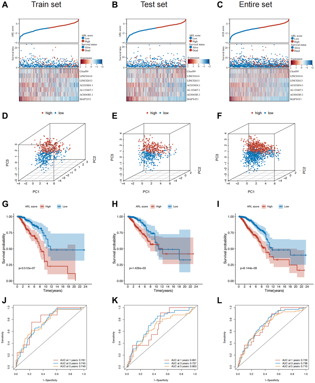 Patients in both sets were further classified into high and low ARL score groups based on the median ARL score. The ARL score distribution, survival status, and expression levels of the seven core lncRNAs in the low- and high ARL score groups are shown in Figure 2A–2C. These results illustrate the intuitive differences between the two groups in the training, testing, and entire sets, which were supported by Principal Component Analysis (PCA) (Figure 2D–2F).