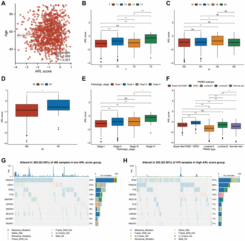 Additionally, we investigated the clinical significance of a prognostic model utilizing ARLs by assessing their association with clinical features. As shown in Figure 3A, a significant correlation was observed between age and the ARL score (P < 0.05). Individuals diagnosed with T4, N2, M1, and stage IV conditions demonstrated the most elevated ARL scores, signifying that elevated ARL scores are associated with advanced TNM and pathological stages. (Figure 3B–3E) (P < 0.05). Among the PAM50 breast cancer subtypes, patients with HER2-enriched breast cancer had the highest ARL scores (P < 0.001), whereas those with luminal A breast cancer had the lowest scores (Figure 3F) (P < 0.05). Interestingly, the frequency of PIK3CA gene mutation was highest (44%) in the group with a low ARL score, in contrast to a mutation rate of 26% in the group with a high ARL score. In the high ARL score group, TP53 emerged as the gene with the highest occurrence of mutations, with a frequency of 47%, whereas the low ARL score group had a mutation rate of only 20% (Figure 3G, 3H). Furthermore, to confirm that the ARL score could differentiate patients with varying prognoses across different breast cancer subtypes, we conducted survival analyses stratified by the ARL score within each breast cancer subtype. The results of our study suggest that patients with low ARL scores consistently had better prognoses (P < 0.05) in all four breast cancer subtypes, namely, basal-like/TNBC, luminal A, luminal B, and normal-like. Although a comparable pattern was observed in patients with HER2-amplified breast cancer, the difference was not statistically significant (P > 0.05), possibly because of the small number of participants in this specific patient cohort (Supplementary Figure 2B). These findings suggest the potential utility of the ARL-based prognostic model in aiding the diagnosis, prognostication, and formulation of treatment strategies.