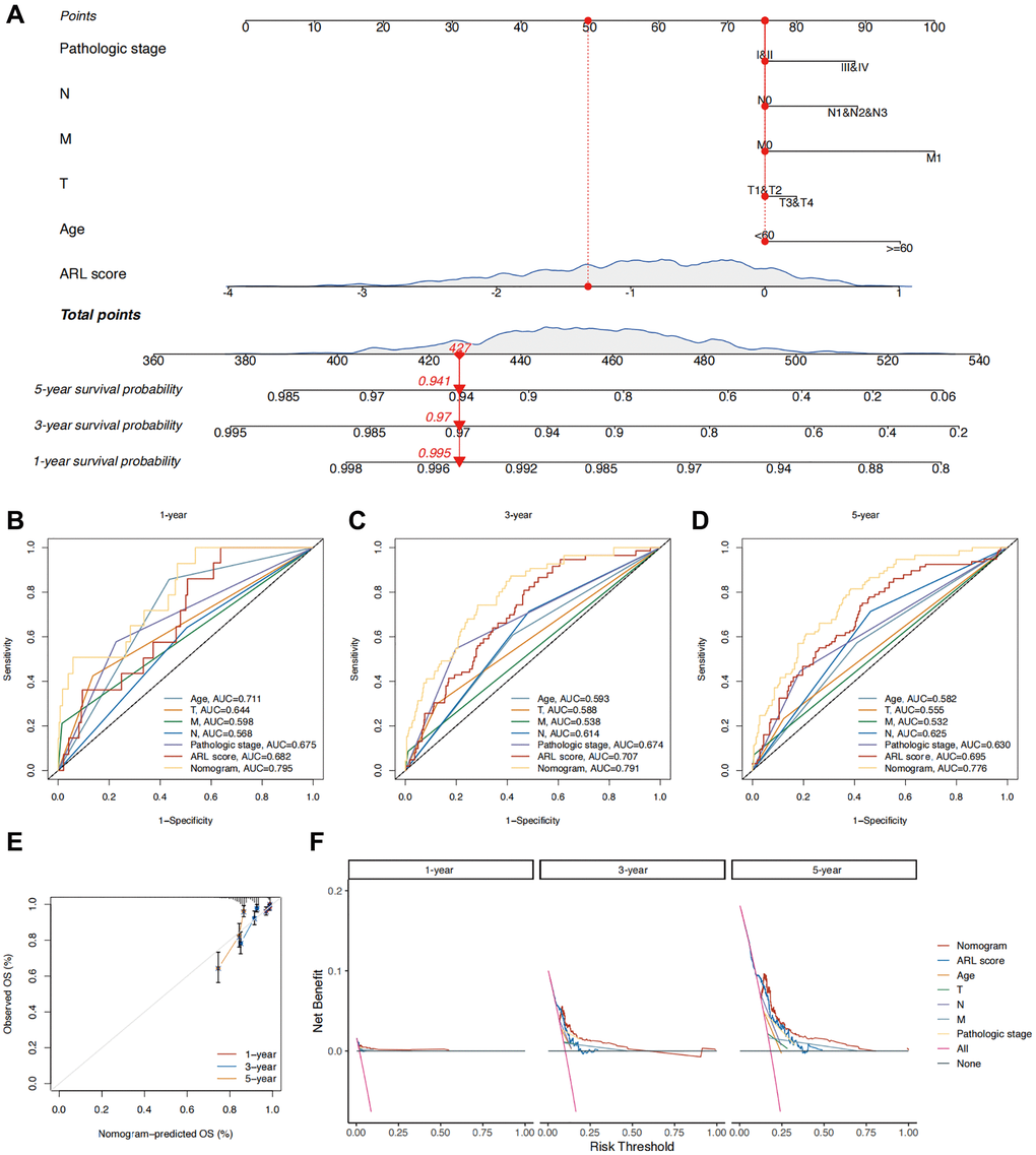 To improve the practicality of the prognostic model, the ARL scores were integrated with prognostic clinical characteristics to develop a nomogram that predicts the overall survival (OS) of patients with IBC (Figure 4A). To assess the superiority of the nomogram in predicting outcomes, various parameters, such as age, T stage, N stage, M stage, pathological stage, and ARL score, were evaluated using a Receiver Operating Characteristic (ROC) curve. As shown in Figure 4B–4D, the AUC values for predicting the 1-, 3-, and 5-year outcomes using the nomogram (0.795, 0.791, and 0.776, respectively) were higher compared to age (0.711, 0.593, and 0.582, respectively), T stage (0.644, 0.588, and 0.555, respectively), N stage (0.568, 0.614, and 0.625, respectively), M stage (0.598, 0.538, and 0.532, respectively), pathological stage (0.675, 0.674, and 0.630, respectively), and ARL scores (0.682, 0.707, and 0.695, respectively). This indicates the strong ability of the nomogram to predict the prognosis of IBC. Figure 4E shows a calibration plot, indicating that the nomogram exhibited a favorable capacity for predicting patient prognosis. Based on the decision curve analysis (DCA) results for 1-, 3-, and 5-year periods, it can be inferred from Figure 4F that the nomogram exhibited superior clinical usefulness compared to alternative factors. The nomogram prediction model, which is based on ARL scores and clinicopathological features, has been thoroughly validated using various approaches and has demonstrated robust predictive capacity and clinical usefulness.
