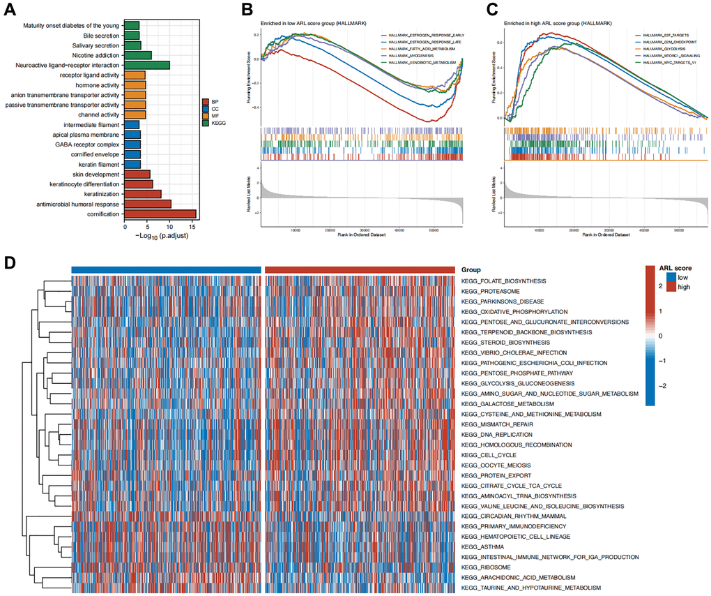 To clarify the possible biological roles and pathways linked to the ARL signature, we performed various enrichment analyses such as GSEA, GSVA, GO, and KEGG. The results of the GO and KEGG enrichment analyses in Figure 5A show a significant correlation between differentially expressed genes (DEGs) in the low and high ARL score groups and signal transduction-related biological functions, including channel activity, passive transmembrane transporter activity, anion transmembrane transporter activity, hormone activity, and receptor ligand activity.