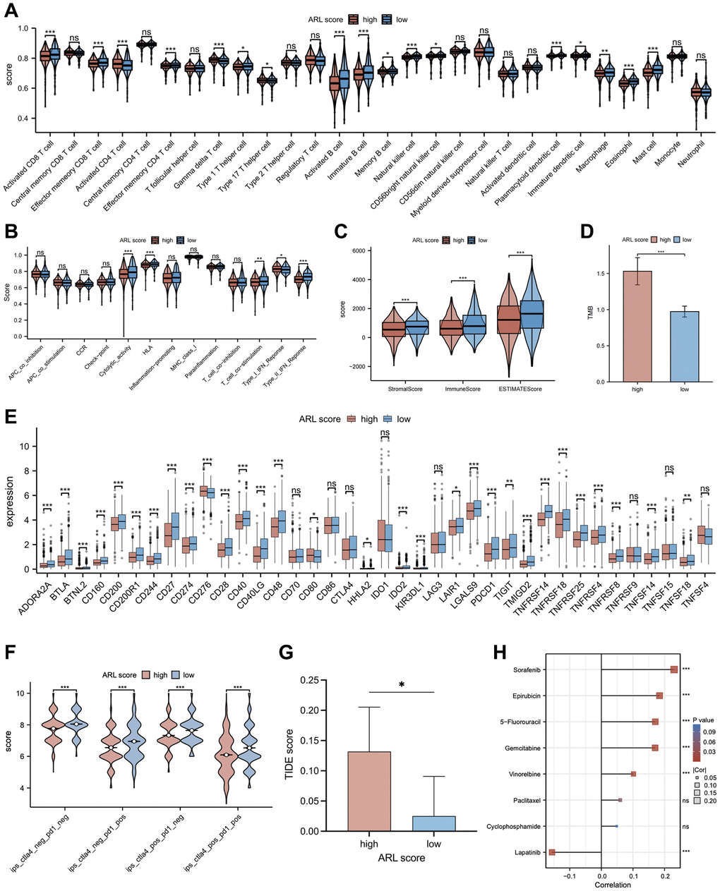 In light of mounting evidence that immune infiltration characteristics have a major impact on the progression and development of breast cancer, we accessed the relationship between immune infiltration characteristics and ARL scores. As shown in Figure 6A, the low ARL score group exhibited significantly higher infiltration fractions of immune cells (P < 0.05). Furthermore, Figure 6B demonstrates that immune-related pathways, including cytolytic activity, human leukocyte antigen (HLA), T cell co-stimulation, and type II IFN response, were highly enriched in the low ARL score group, whereas only the type I IFN response was highly enriched in the high ARL score group (P < 0.05). Additionally, the low ARL score group exhibited significantly higher immune, stromal, and estimated scores than the high ARL score group (P < 0.05), as depicted in Figure 6C.