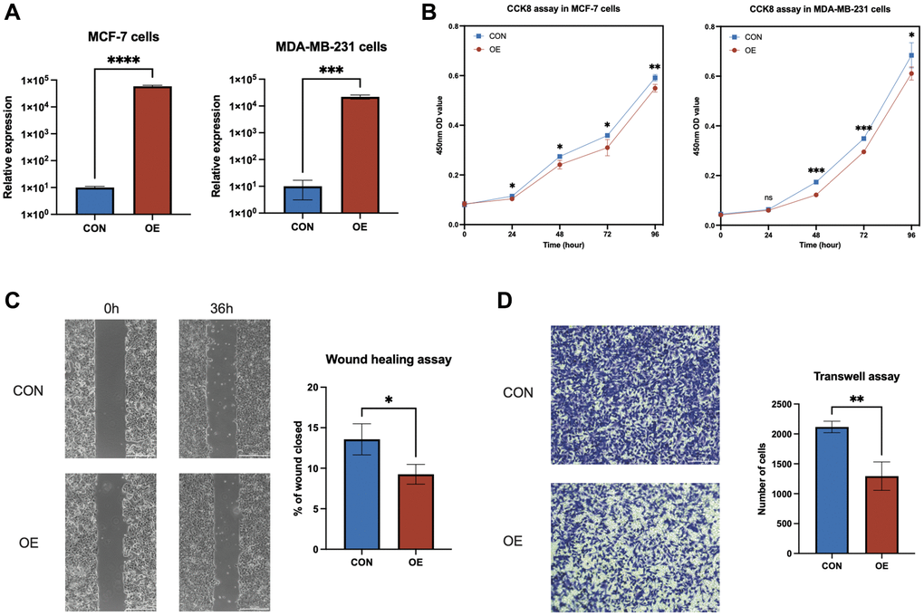 The human breast cancer cell lines MCF-7 and MDA-MB-231 were sourced from Wuhan Procell Life Science and Technology Co., Ltd., (Wuhan, China). We propagated MCF-7 cells in minimum Eagle’s medium (MEM), supplemented with 10% fetal bovine serum (Gibco, USA), 0.01 mg/mL insulin, 100 U/mL penicillin G, and 100 μg/mL streptomycin. MDA-MB-231 cells were grown in Dulbecco’s modified Eagle’s medium (DMEM), supplemented with 10% fetal bovine serum (Gibco, USA), 100 U/mL penicillin G, and 100 μg/mL streptomycin. Both cell lines were incubated in a 5% CO2 atmosphere at 37°C. To assess the effect of AL133467.1, Lipofectamine™ 3000 (Invitrogen, USA) was used to transfect pcDNA-AL133467.1/pcDNA (negative control) into MCF-7 and MDA-MB-231 cells according to the Lipofectamine™ 3000 reagent protocol. Functional assays were performed, and RNA was collected 48 h after transfection.
