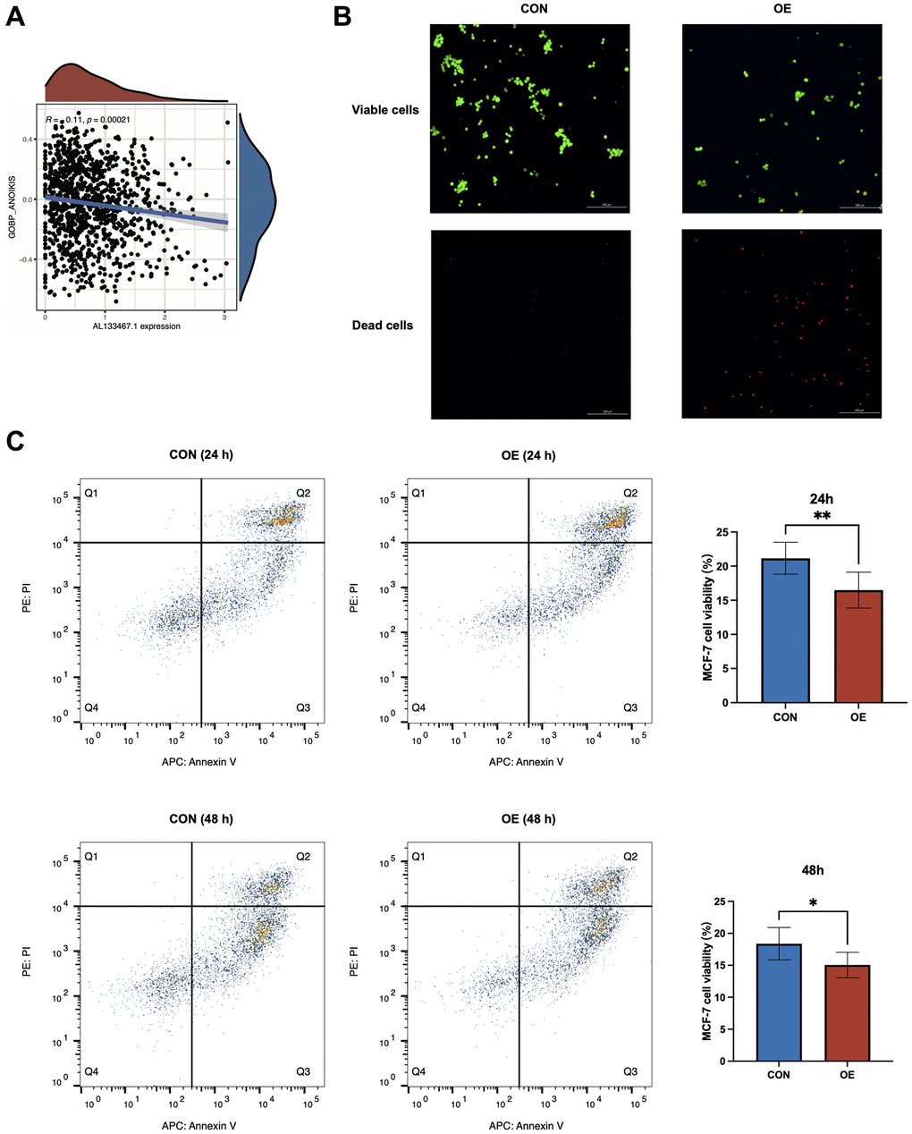To elucidate the effect of AL133467.1 expression on anoikis in breast cancer, we studied the association between AL133467.1 expression and anoikis. As depicted in Figure 8A, AL133467.1 expression was negatively correlated with anoikis, suggesting that AL133467.1 can potentially function as a negative regulator of anoikis. To confirm these findings, we induced anoikis in MCF-7 cells by preventing cell adhesion to the culture dish. As depicted in Figure 8B, following a 24-hour incubation, the cells overexpressing AL133467.1 exhibited lower viability than the control cells. To quantitatively assess differences between the two groups, flow cytometry was used to measure cell viability. After a 24-hour or 48-hour incubation in an anti-adhesion environment, the overexpression group displayed significantly reduced cell viability relative to the control group (Figure 8C). These findings suggest that overexpression of AL133467.1 may enhance anoikis in MCF-7 cells.
