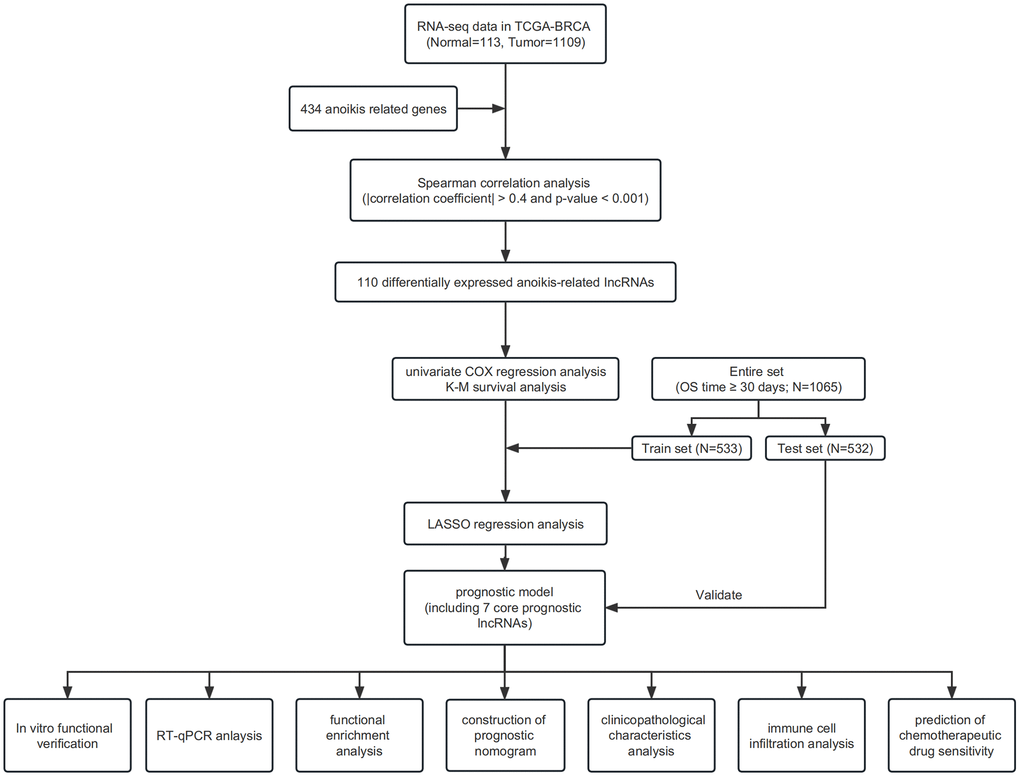 The main information utilized for this research was obtained from TCGA repository, comprising 1,109 IBC samples and 113 healthy breast tissue samples. Patients with unknown clinical information and an overall survival time of less than 30 days were excluded from the study. Gene sets associated with anoikis were obtained from a prior investigation [43]. Figure 9 shows the flowchart of our study.