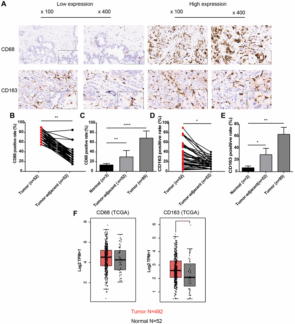 To analyze the infiltration levels of TAMs in PCa, we first observed the general expression patterns of CD68 (TAM-marker) and CD163 (M2-TAM marker) proteins in PCa and adjacent normal tissues using TMAs containing 96 PCa samples (52 with matched adjacent normal tissues). The IHC results demonstrated that CD68 and CD163 in PCa tissues were diffusely expressed in stromal cells with membranous and cytoplasmic staining, indicating that TAMs were indeed infiltrating PCa tissues with a dispersed distribution pattern (Figure 1A). Moreover, tumor cells exhibited less positive staining with CD68 and CD163. We further analyzed the signal intensity of CD68 and CD163 proteins in cancerous and normal tissues, revealing that the positive rate of CD68 in PCa was significantly higher than that in tumor-adjacent and normal tissues, with average percentages of 68.68 ± 14.72, 29.90 ± 13.15, and 13.33 ± 2.89, respectively (Figure 1B, 1C, P < 0.01). These findings were similar to the results for CD163 (Figure 1D, 1E, 63.07 ± 11.76 vs. 28.75 ± 10.61 vs. 6.67 ± 2.89, P < 0.05). In addition to the IHC results, CD68 and CD163 were also upregulated at the mRNA level in TCGA-PRAD dataset (Figure 1F). These results suggested that the infiltration levels of TAMs, including CD68+ TAMs and CD163+ TAMs (M2), were increased in PCa.