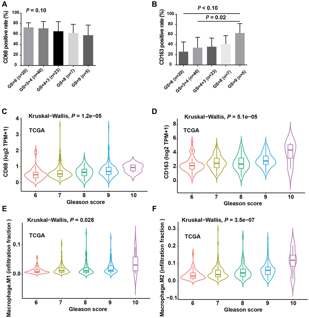 In the present study, we also examined CD163, a highly specific marker for M2-TAMs. Different from CD68, the number of CD163+ infiltrating TAMs, as well as CD68 mRNA expression, was increased with Gleason score and associated with risk stratification of PCa patients. A high level of CD68 mRNA/protein expression indicates a shorter BCR-free time. This was similar to a previous report by Marina Kazantseva and colleagues, which found that high levels of CD163+ TAM infiltration were associated with higher Gleason score [29]. Consistently, in cervical cancer and oral carcinomas, high levels of CD163+ TAMs infiltration were also associated with worse disease-free survival (DFS) [10, 30, 31].
