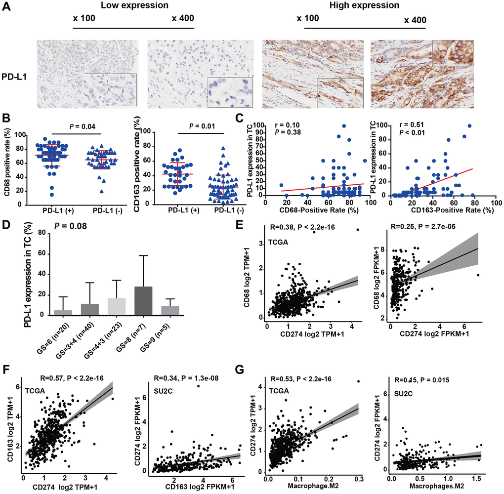 We further analyzed the mRNA expression correlation among CD68, CD163, and CD274 (encoding the PD-L1 protein) in two independent datasets, TCGA-PRAD, and prad_su2c_2019. In line with our local cohort, the results demonstrated that CD274 mRNA expression was significantly positively correlated with CD68 (Figure 3E) and CD163 (Figure 3F) mRNA expression. Notably, the infiltration level of M2-TAMs was also strongly correlated with CD274 expression in TCGA-PRAD and prad_su2c_2019 cohorts (Figure 3G). This is in agreement with our IHC data, which indicated that PCa with higher levels of M2-TAM infiltration exhibited elevated levels of PD-L1 expression. Furthermore, CD163 mRNA expression was also significantly positively associated with CD68 mRNA expression in the two PCa RNA-Seq cohorts (Supplementary Figure 2A). Additionally, CD68 mRNA and CD163 mRNA expression were positively associated with the levels of M2-TAM infiltration (Supplementary Figure 2B, 2C). In summary, these results suggested that PD-L1 expression is associated with M2-TAM infiltration in PCa.