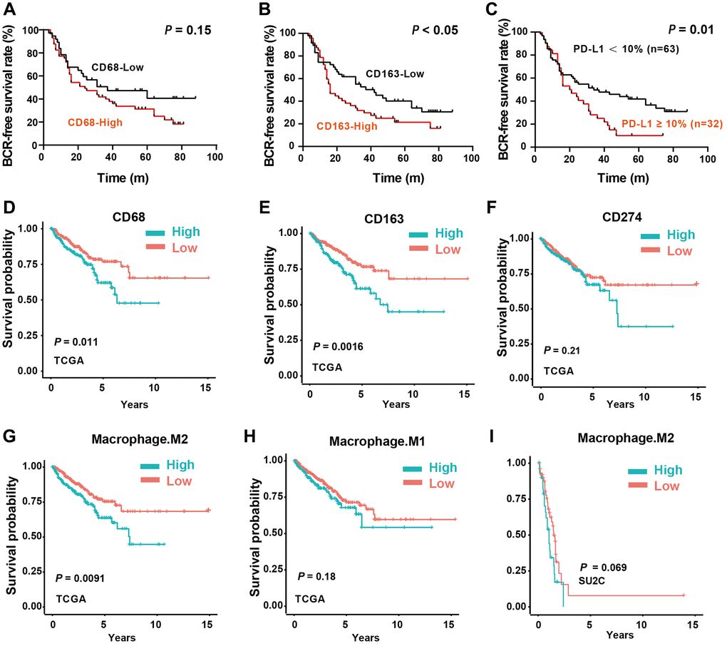 In support, we also analyzed the clinical significance of CD68 and CD163 mRNA expression in TCGA-PRAD and prad_su2c_2019 cohorts. Consistent with the local cohort, high CD68 (Figure 4D) and CD163 (Figure 4E) mRNA expression were associated with poor prognosis of PCa patients. However, CD274 mRNA expression showed no association with the prognosis, which is also consistent with the IHC data (Figure 4F). Notably, we found that the infiltrated M2-TAMs had significant prognosis value in predicting DFS (Figure 4G), whereas M1-TAMs were not correlated with the clinical outcome of PCa patients (Figure 4H). Consistently, the infiltration level of M2-TAMs was correlated with the prognosis in the SU2C dataset (Figure 4I). In summary, these results suggested that PD-L1 protein expression is a promising biomarker for outcome prediction, and M2-TAMs infiltration is tightly linked with the progression of PCa.