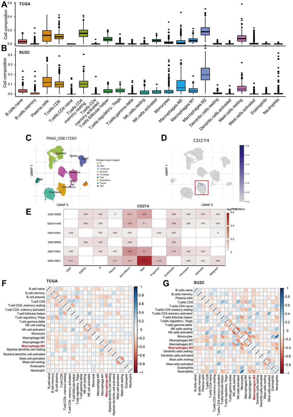 The analysis also showed that M2-TAMs were the most abundant immune cells across the 22 analyzed cell types (Figure 6A, 6B). Furthermore, we analyzed six single-cell RNA-Seq data of PCa to characterize the cellular source of the CD274 expression across multiple cell types. Notably, the results suggested that Monocells/macrophages exhibit a higher expression of CD274 compared with other cells (Figure 6C–6E), suggesting TAMs were indeed the source of PD-L1 expression in bulk tumors. We also found that M2-TAMs were significantly negatively correlated with a large fraction of other immune cells, strongly suggesting that M2-TAMs play important roles in immune modulation in PCa (Figure 6F, 6G).
