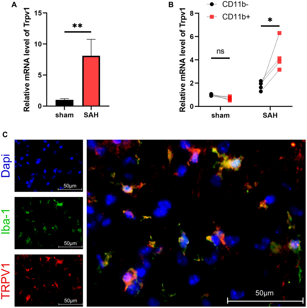 TRPV1 plays crucial roles in various physiological and pathological processes, including sensation of mechanical stimuli, voltage sensitivity, response to chemical substances, immune activation, modulation of temperature, gastrointestinal function regulation, and involvement in tumorigenesis. The results of qPCR showed that the mRNA level of Trpv1 was increased at 24 hours after SAH (Figure 1A). Using MACS to separate the brain cells into CD11b positive and negative cells, it was found that Trpv1 changed most significantly in the CD11b positive cells (Figure 1B). Consistently, immunofluorescence staining demonstrated that TRPV1 was mainly expressed in microglia/macrophages (Figure 1C).The expression status of TRPV1 in microglia and macrophages deserves further study.