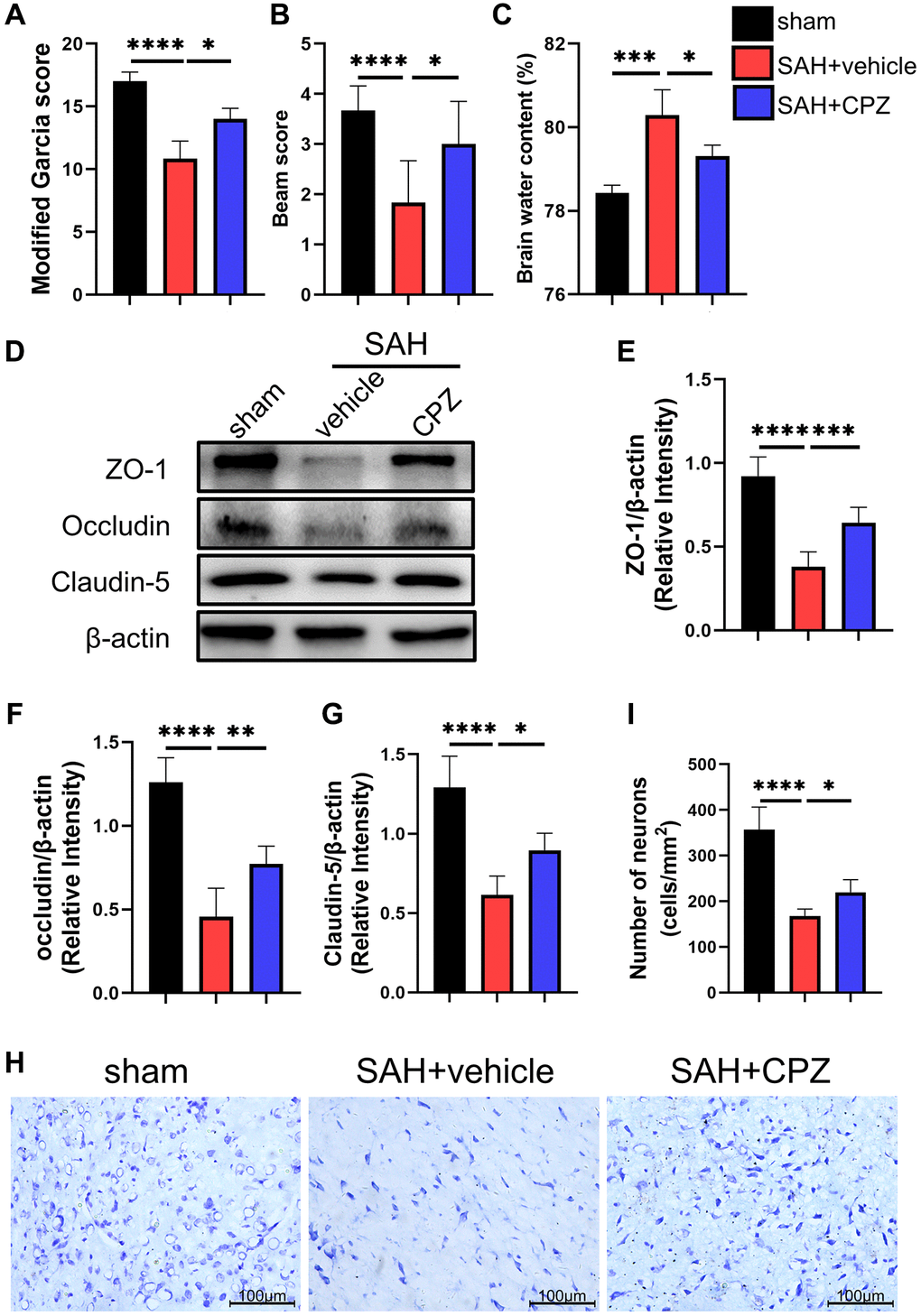 We conducted follow-up studies to investigate the effect of TRPV1 on neurological impairment, CPZ, a selective TRPV1 antagonist, was introduced. Neurobehavioral scores including modified Garcia scores and beam scores showed severe neurological dysfunction after SAH when compared with the sham group. However, blockage of TRPV1 with CPZ improved the neurological dysfunction (Figure 2A, 2B). The administration of CPZ dramatically reduced the brain water content and upregulated the expression of tight junction proteins including ZO-1, occluding, and claudin-5 (Figure 2C–2G). Nissl staining also showed that CPZ increased the number of neurons (Figure 2H, 2I).