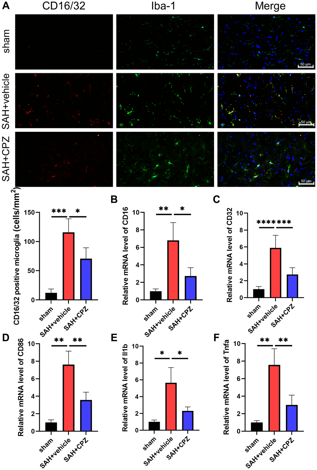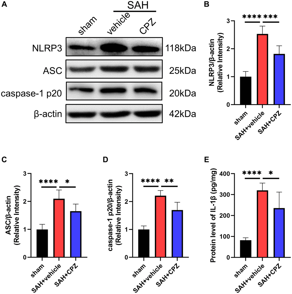We have learned that TRPV1 activation affects nerve function damage. Can the inhibition of TRPV1 alleviate nerve function damage? We have conducted further research on the possible mechanism of TRPV1 in alleviating nerve function damage. Immunofluorescence staining demonstrated that the number of CD16/32 positive microglia/macrophages increased after SAH and reduced after treatment with CPZ (Figure 3A). Consistent with immunofluorescence staining, the mRNA level of CD16, CD32, CD86, IL-1β, and TNF-α was elevated in the SAH+vehicle group, but was reduced in the SAH+CPZ group (Figure 3B–3F). Subsequently, we investigated whether TRPV1 was involved in the activation of the NLRP3 inflammasome. The western blot results showed that the expression of NLRP3, ASC, and caspase-1 p20 were increased in the SAH+vehicle group and reduced in the SAH+CPZ group (Figure 4A–4D). The level of IL-1β showed a similar change as determined via ELISA (Figure 4E).