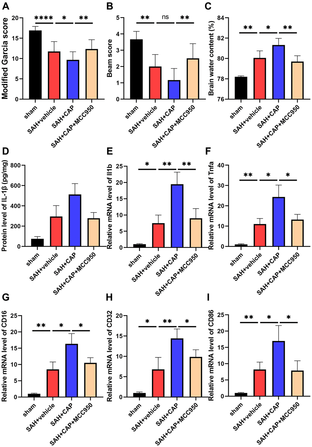 To further investigate the effect of NLRP3 inflammasome on TRPV1-induced neuroinflammation, CAP, a selective TRPV1 agonist, and MCC950, a selective TRPV1 antagonist, were used to activate TRPV1 and inhibit NLRP3, respectively. Administration of CAP decreased the modified Garcia and beam scores and increased the brain water content compared with the SAH+vehicle group, while inhibition of NLRP3 with MCC950 reversed the aggravation of neurobehavioral assessment and brain water content (Figure 5A–5C). Data from ELISA and qPCR confirmed that MCC950 inhibited the elevation of the level of IL-1β, TNF-α, CD16, CD32, and CD86 induced by CAP (Figure 5D–5I).